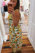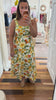 The Fanny Sleeveless Fruit Print Dress combines contemporary trends with timeless style. This maxi dress features a vibrant orange, yellow, and sage green fruit print that brings fresh, seasonal energy to your wardrobe. The fitted bodice flows into a graceful flare silhouette, creating a flattering shape that moves beautifully. A smocked back adds texture and visual interest while ensuring comfortable wear. Sleeveless design keeps you cool and versatile for layering. Fully lined for confidence and comfort. Perfect for showers, wedding, graduations, Easter, casual outings, or elevated everyday wear.