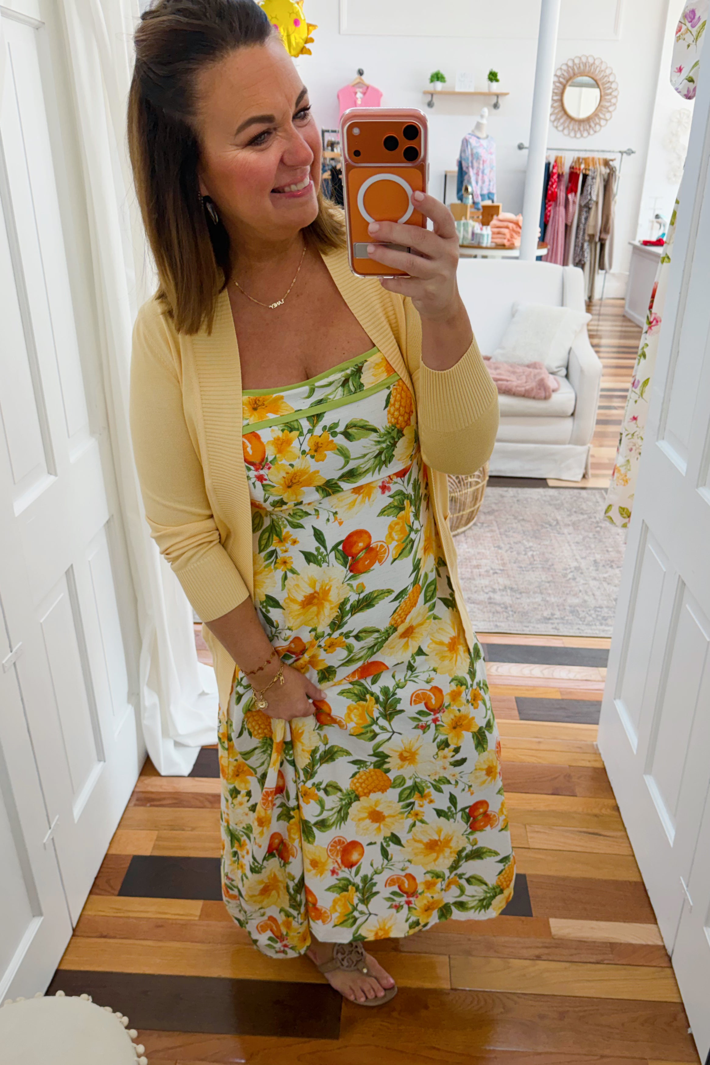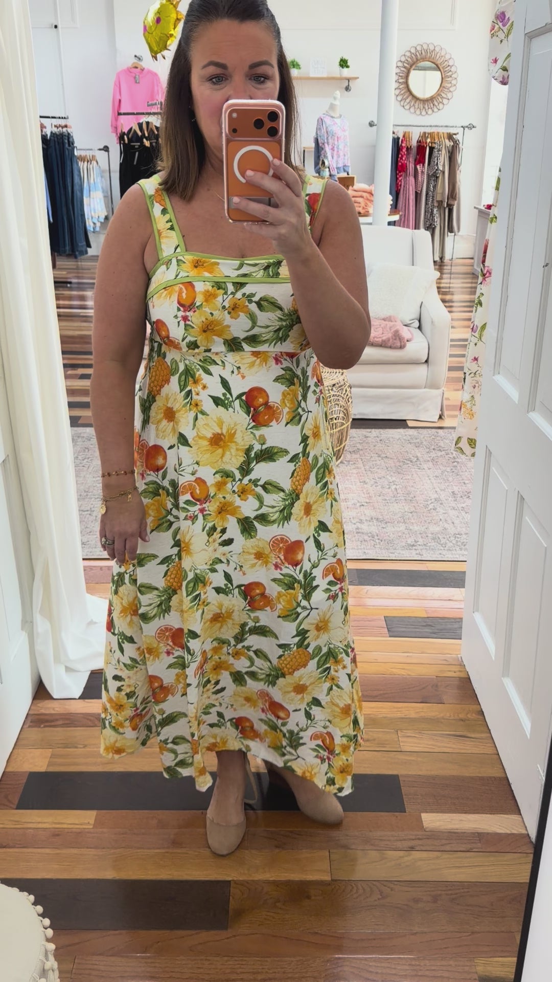 - orange, sage and yellow floral fruit print maxi dress