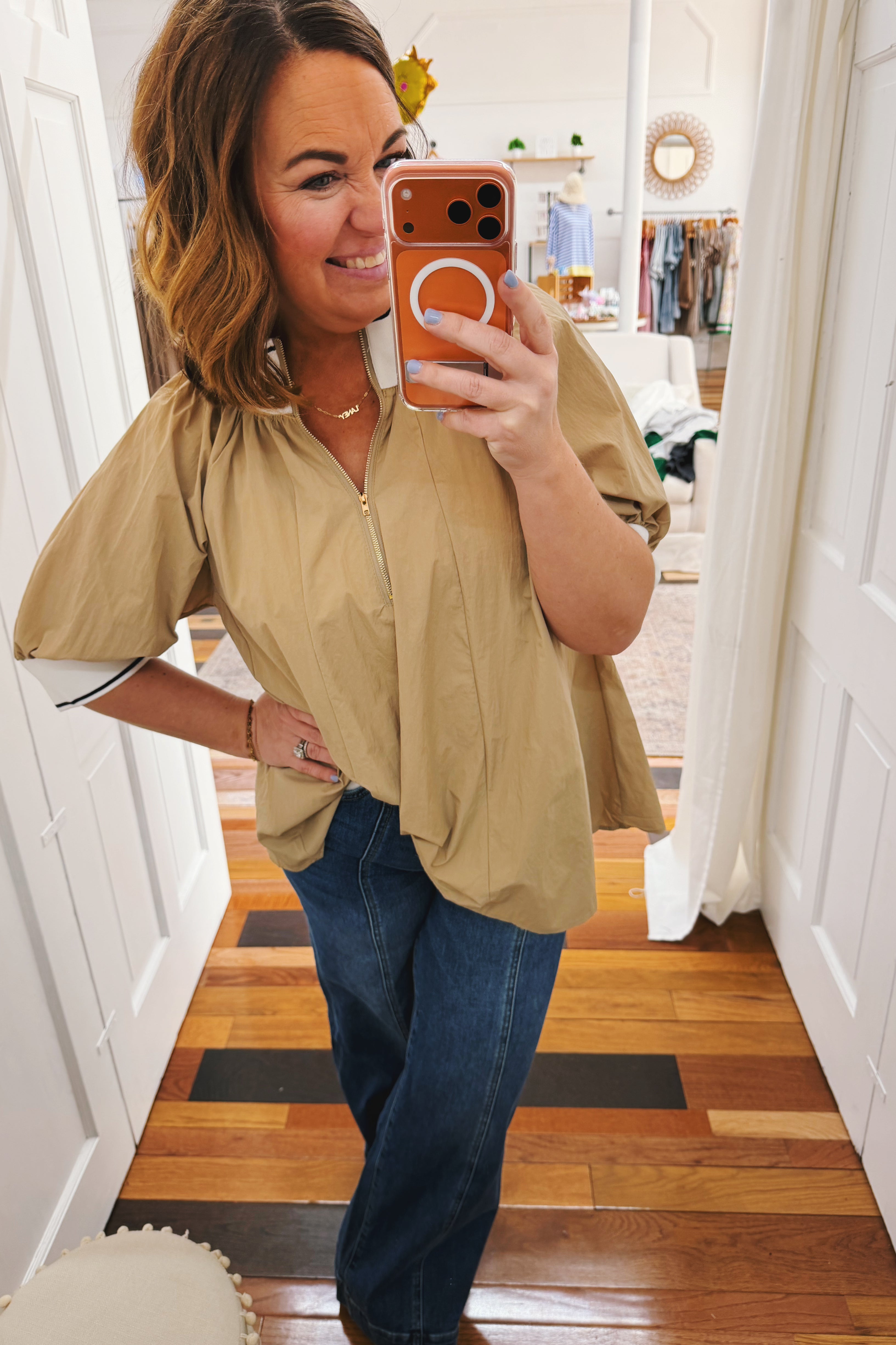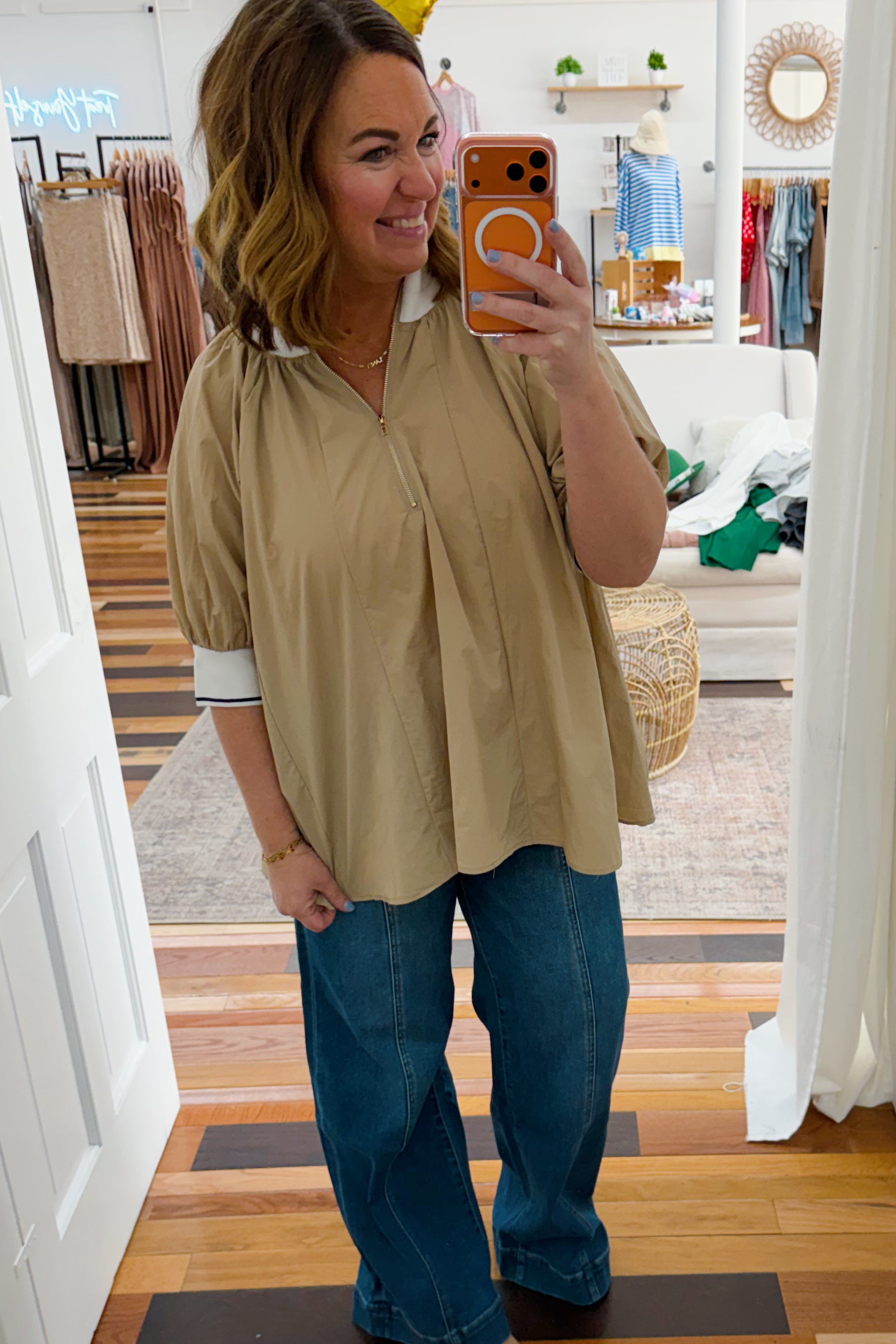 The Fiona Zip Front Nylon Top is a lightweight essential that captures effortless country club elegance. Crafted from smooth nylon, this piece features a flattering flowy fit that moves with you—size down for a more tailored silhouette. The 1/2 zip front offers easy layering versatility, while 1/2 sleeves with finished cuffs add a polished touch. Perfect for transitional weather and weekend getaways, this taupe tone pairs seamlessly with everything in your wardrobe. A Laney favorite for good reason.