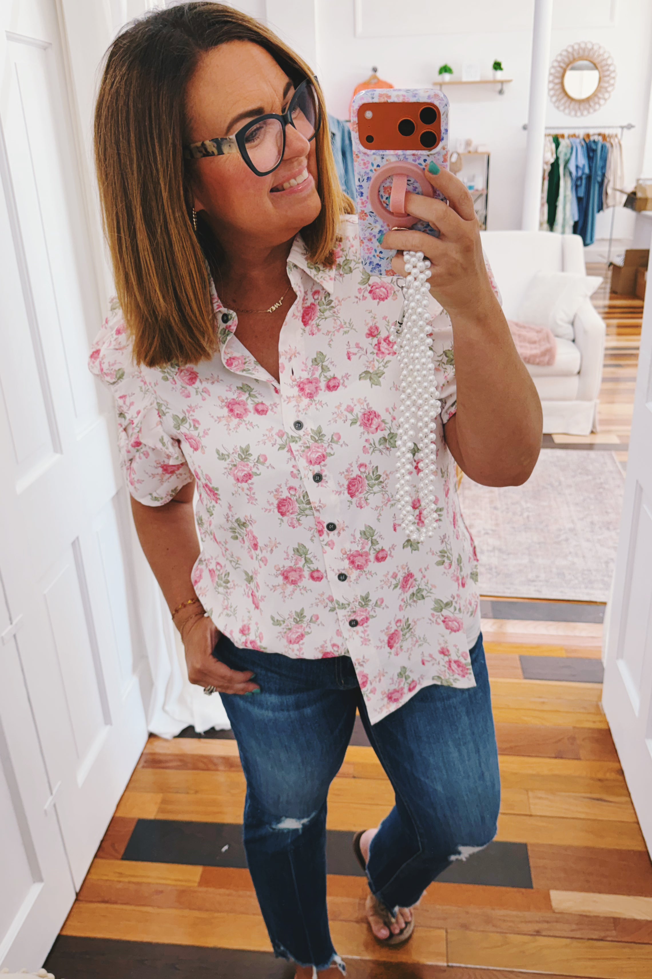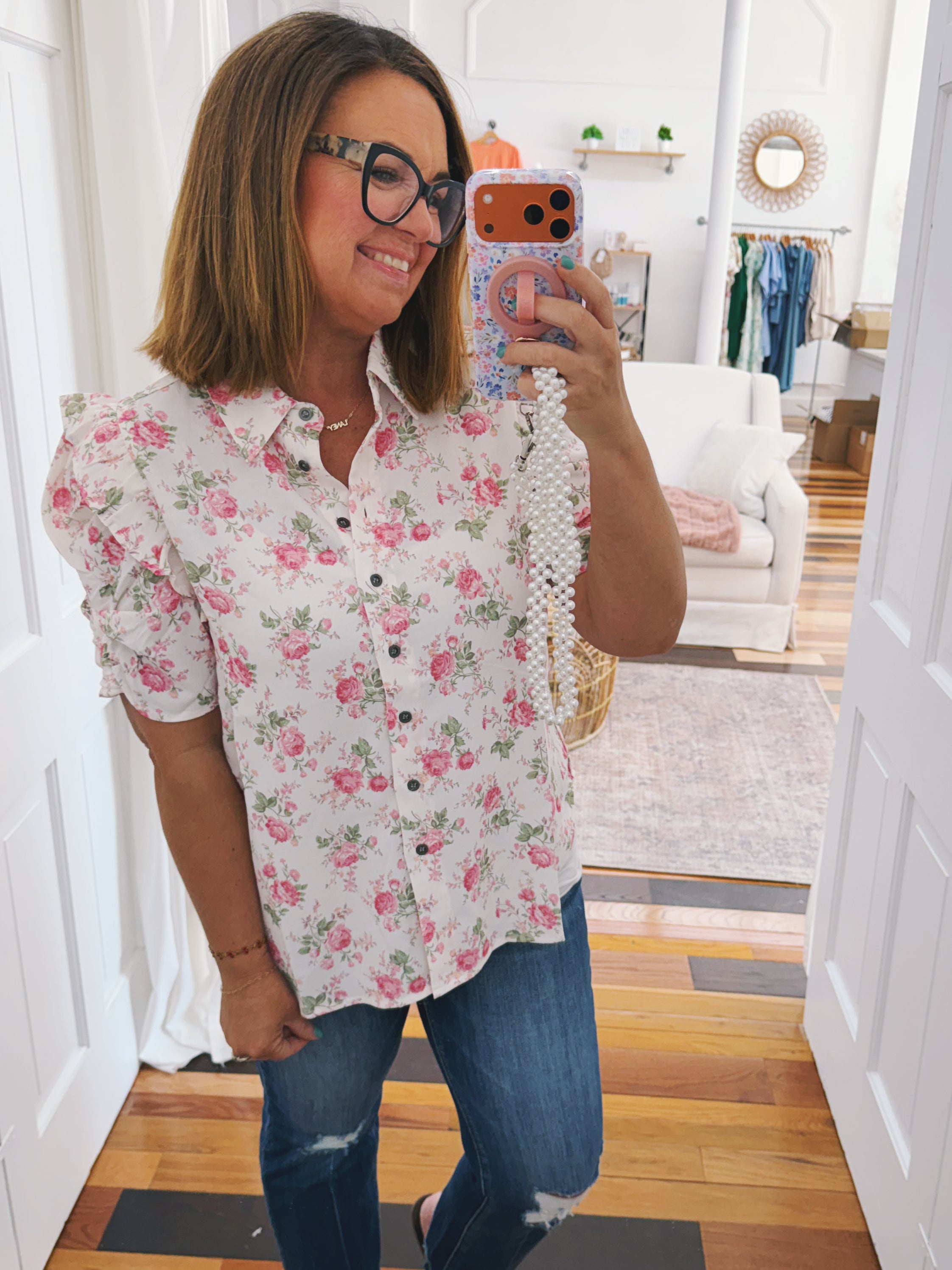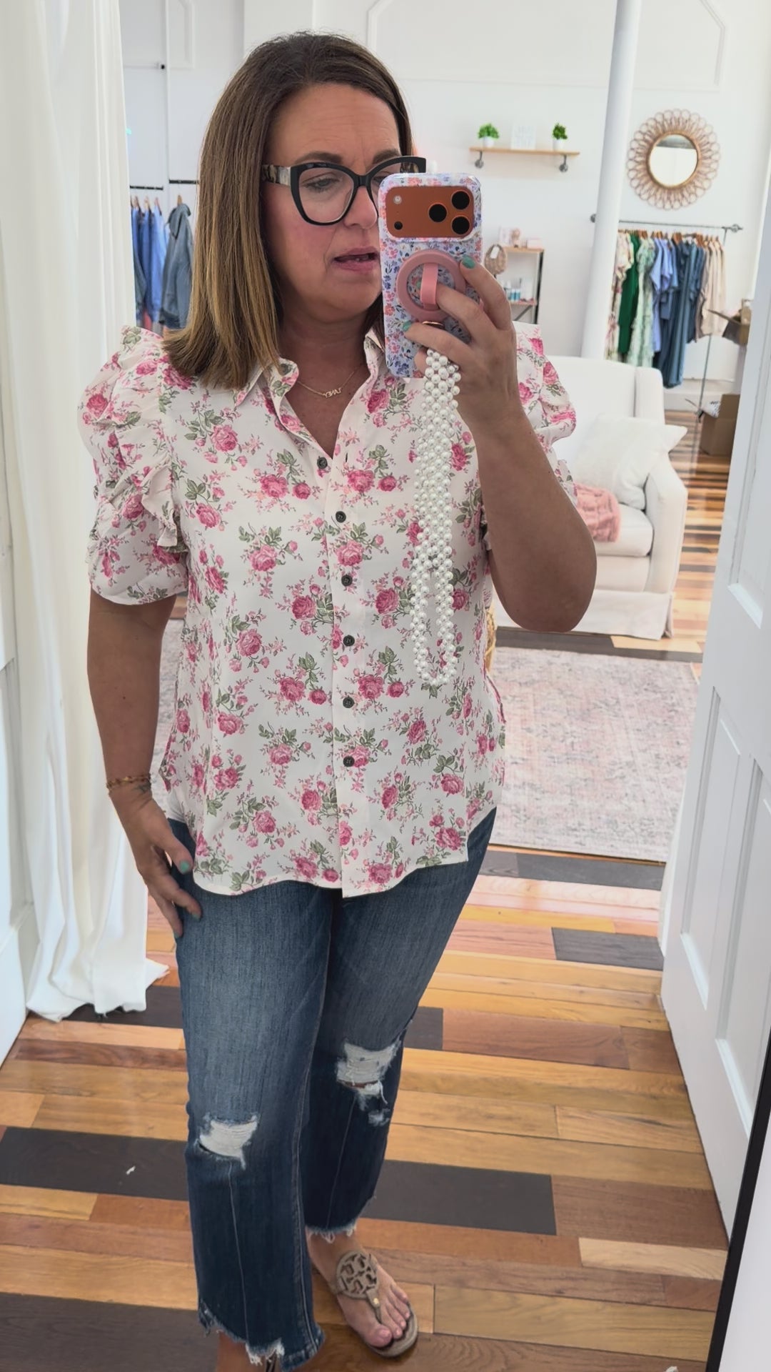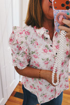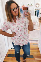 Timeless elegance meets vintage charm in this Frida Collared Floral Blouse. Crafted from quality woven fabric, it features delicate white and pink floral patterns that evoke a romantic, feminine aesthetic. The classic button-front design pairs perfectly with the graceful half sleeves, finished with charming ruffles for added sophistication. Versatile enough for the office or Sunday service, this blouse transitions seamlessly from professional settings to special occasions. The structured collar and refined tailoring create a polished silhouette that flatters and inspires confidence.