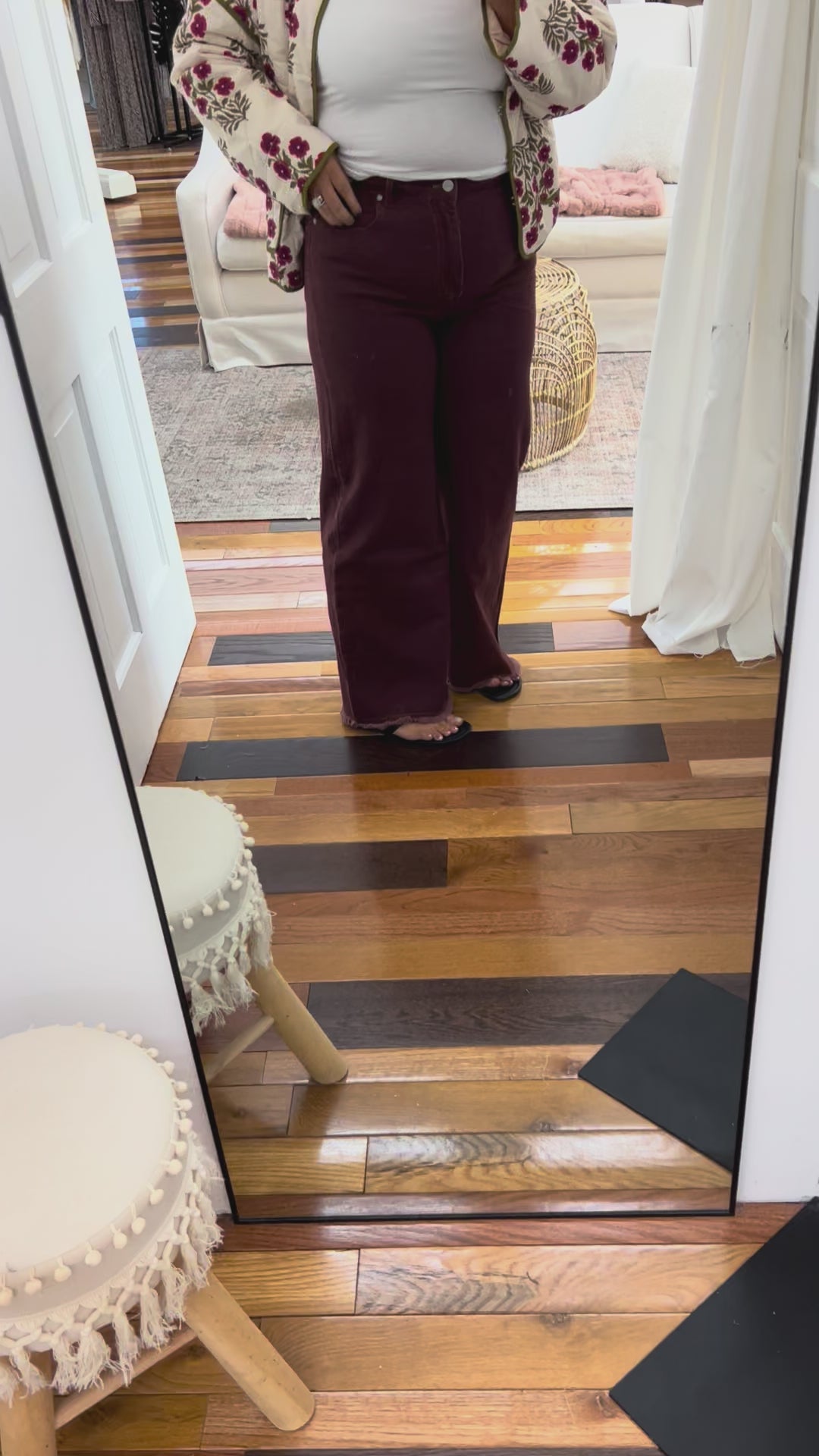 Make a bold statement this fall with the Harriet Vintage Wine Frayed Hem Jeans. These trendy high-rise jeans feature a wide leg and playful frayed hems in a rich wine color. Designed to run small, they offer a flattering, snug fit that’s perfect for layering with your favorite fall essentials.