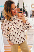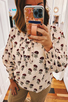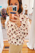 Brighten your wardrobe with the Imogene Floral Ruffle Trim Top in ecru, adorned with charming burgundy floral prints. Its playful ruffle trim adds a touch of vintage sophistication, making this piece both timeless and classic. Perfect for those who love a little flair with their everyday style!