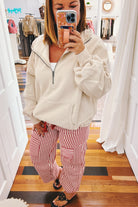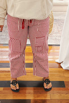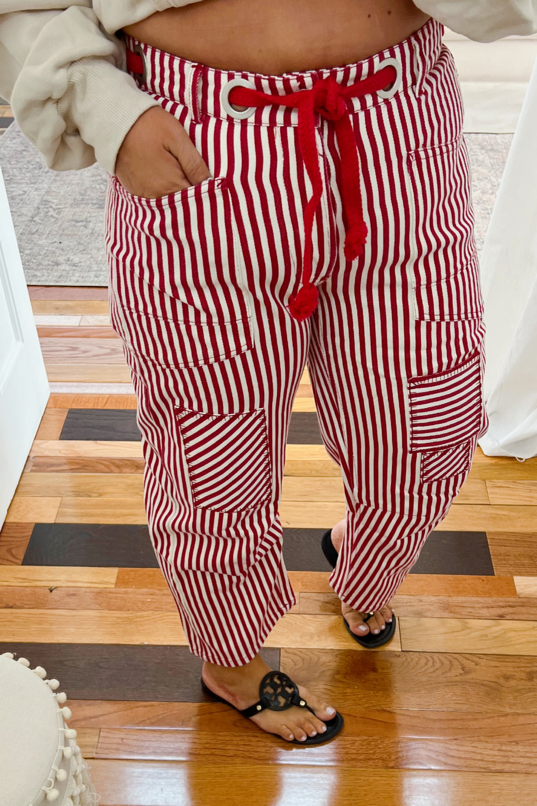 Add a splash of fun to your wardrobe with the Julianne Striped Barrel Pants. These trendy ankle-length pants feature a playful red and white striped denim, a soft barrel style, and a button fly. Complete with a rope belt threaded through grommet loops, they’re made from 100% cotton for vintage denim fit and stylish ease. We love it with our half zip hoodie.
