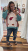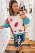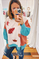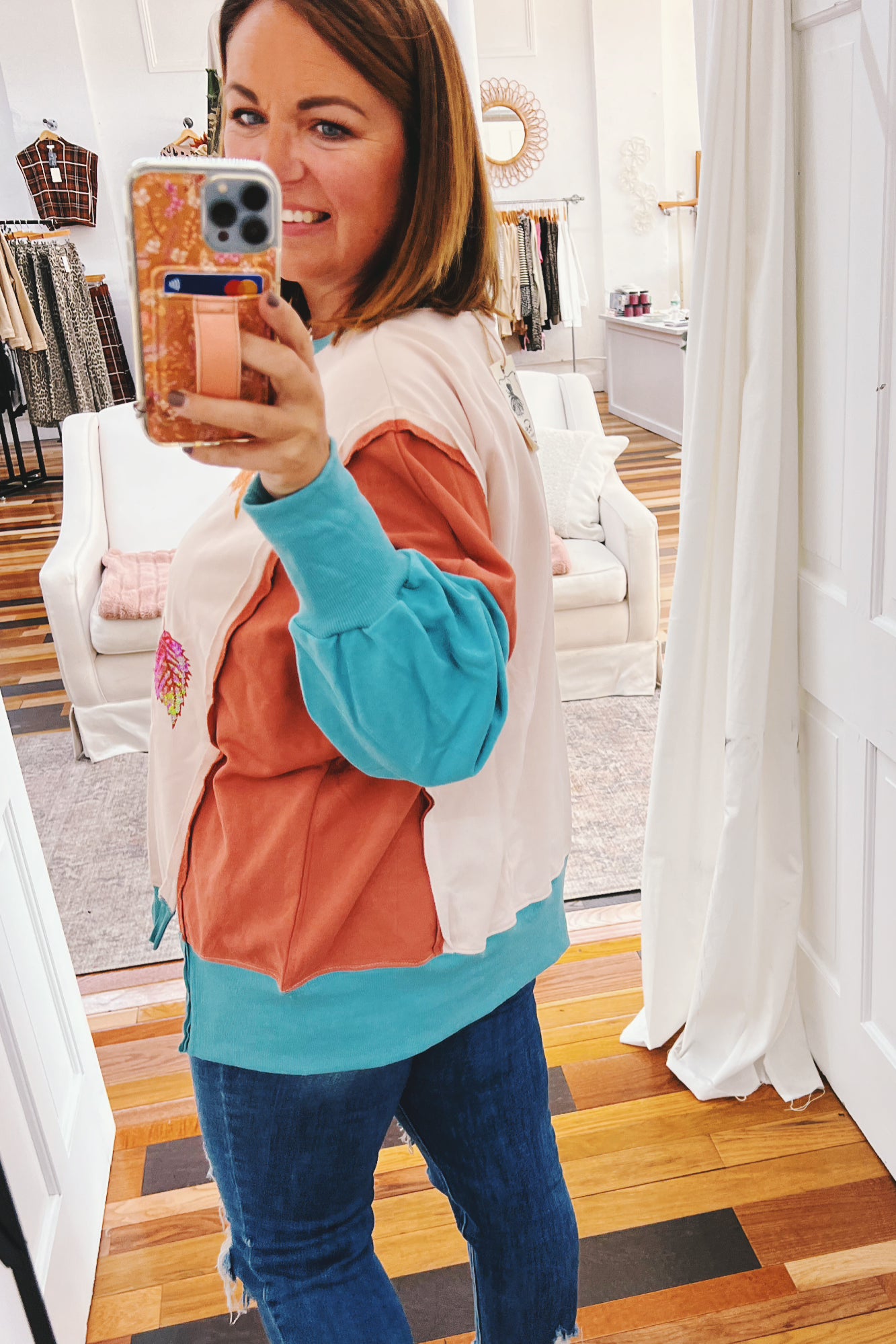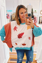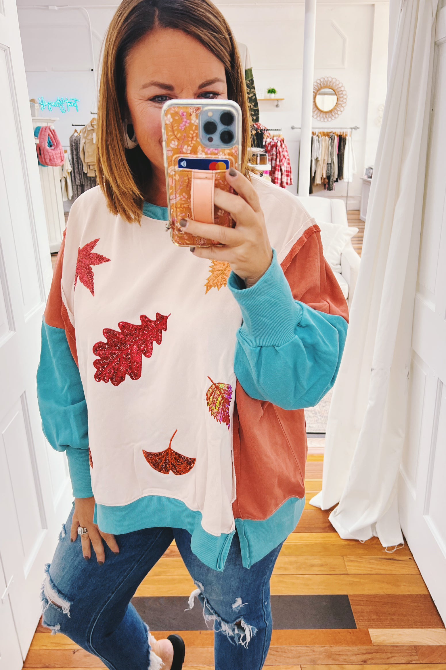 • blue, terrcotta, cream colorblock french terry sweatshirt with sequin leaf accents