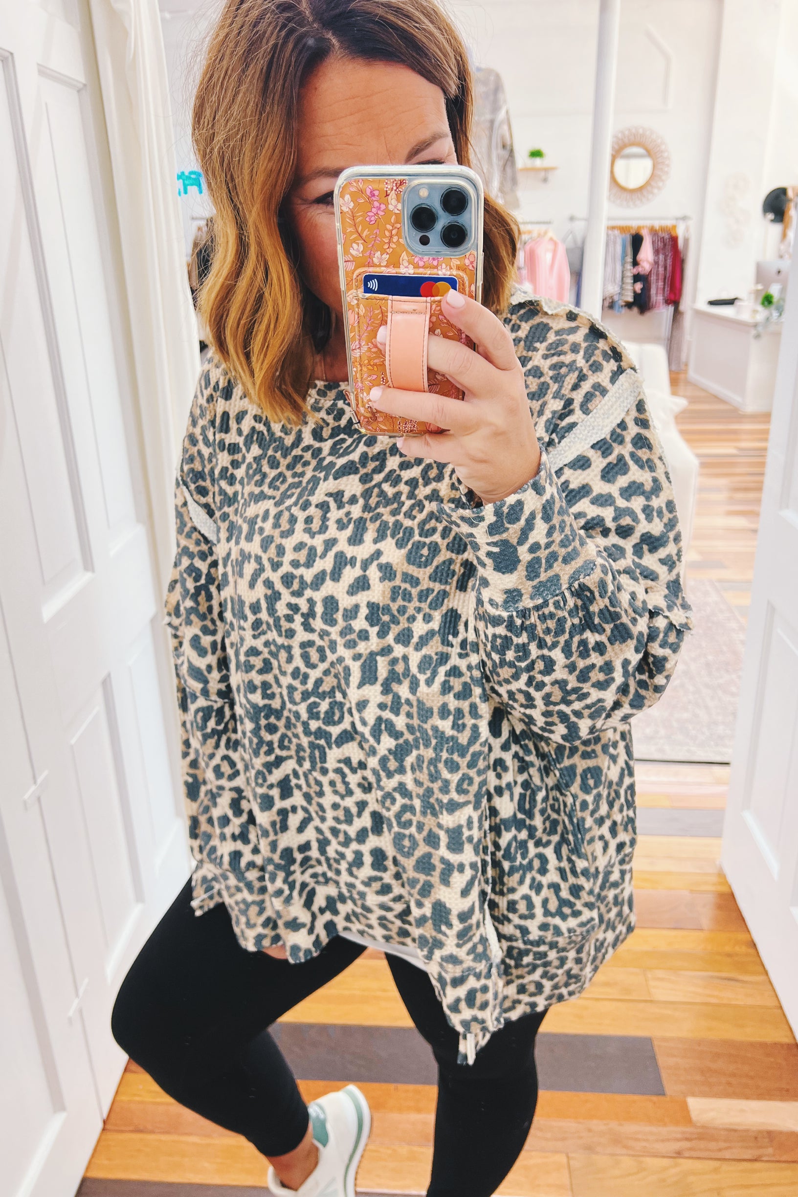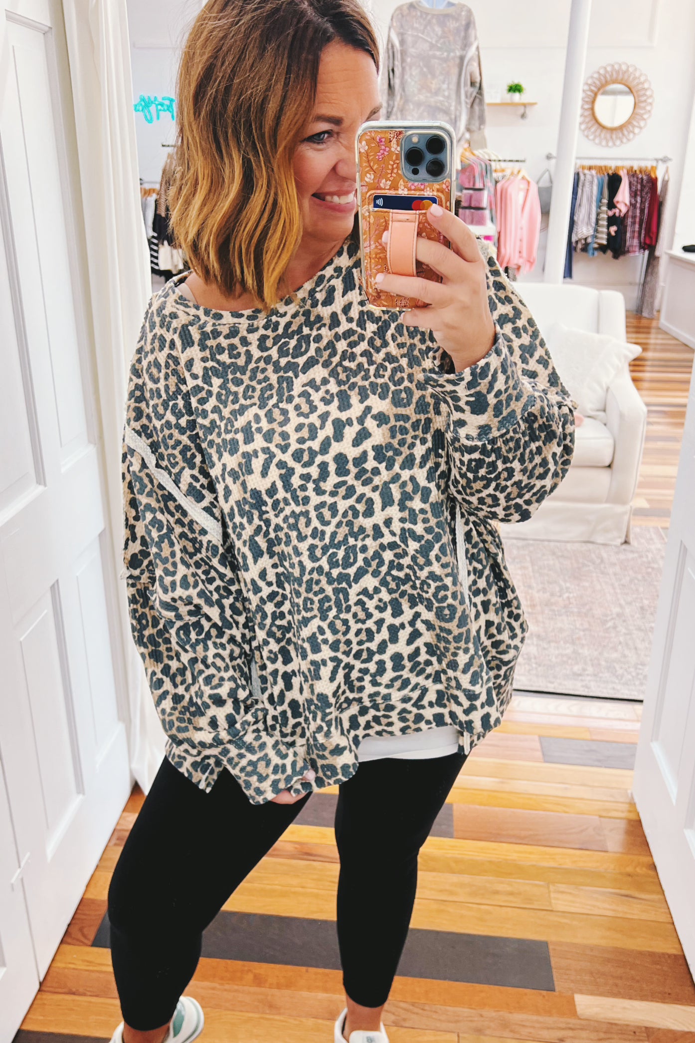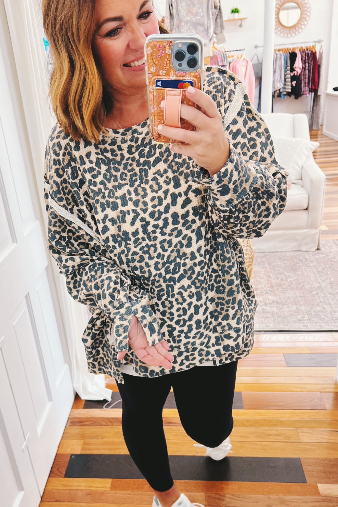 Introducing the Lelani Leopard Oversized Thermal Top - the perfect combination of comfort and style. With a super oversized fit and thermal waffle knit, this top offers both stretch and warmth. Exposed seams add a touch of detail to the classic leopard print in tan and black. The perfect leggings weekend outfit!
