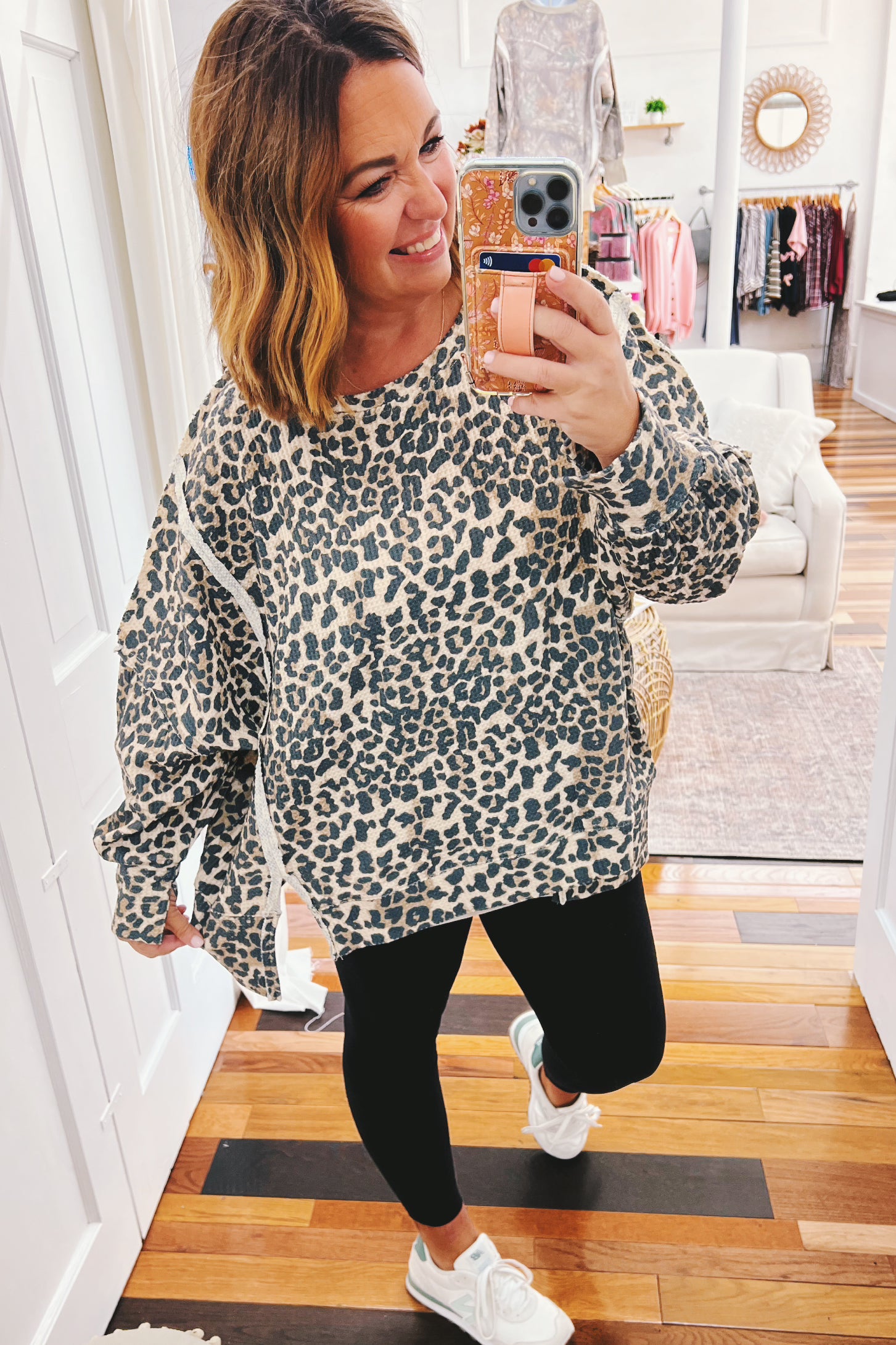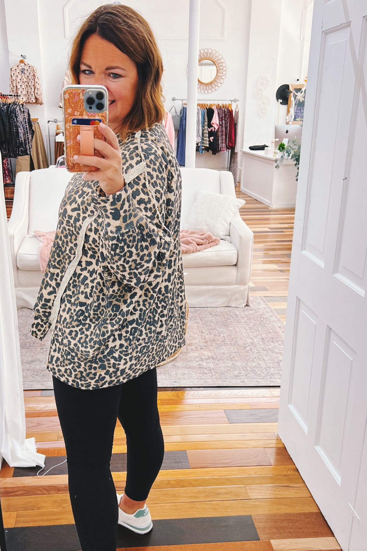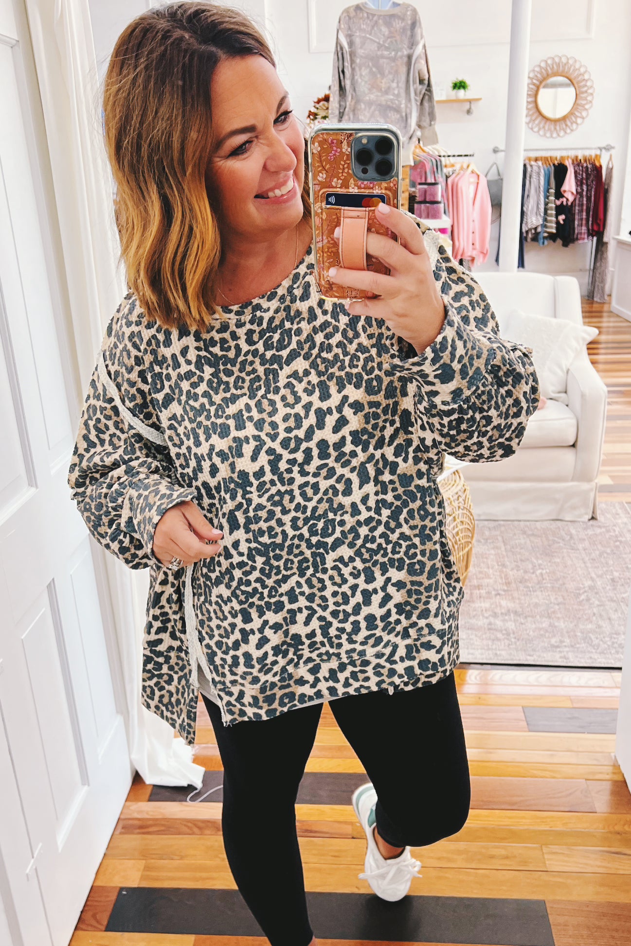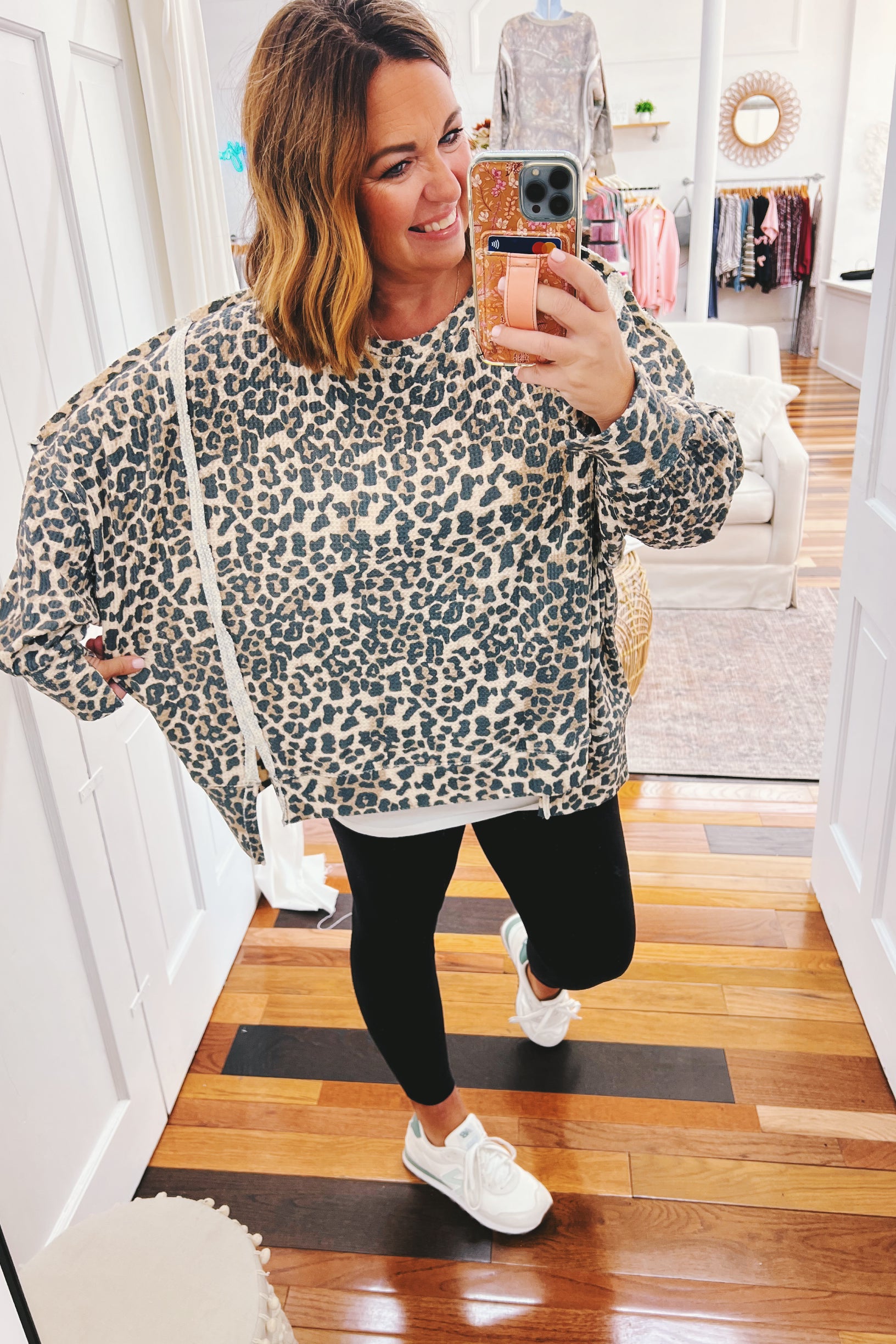 Introducing the Lelani Leopard Oversized Thermal Top - the perfect combination of comfort and style. With a super oversized fit and thermal waffle knit, this top offers both stretch and warmth. Exposed seams add a touch of detail to the classic leopard print in tan and black. The perfect leggings weekend outfit!