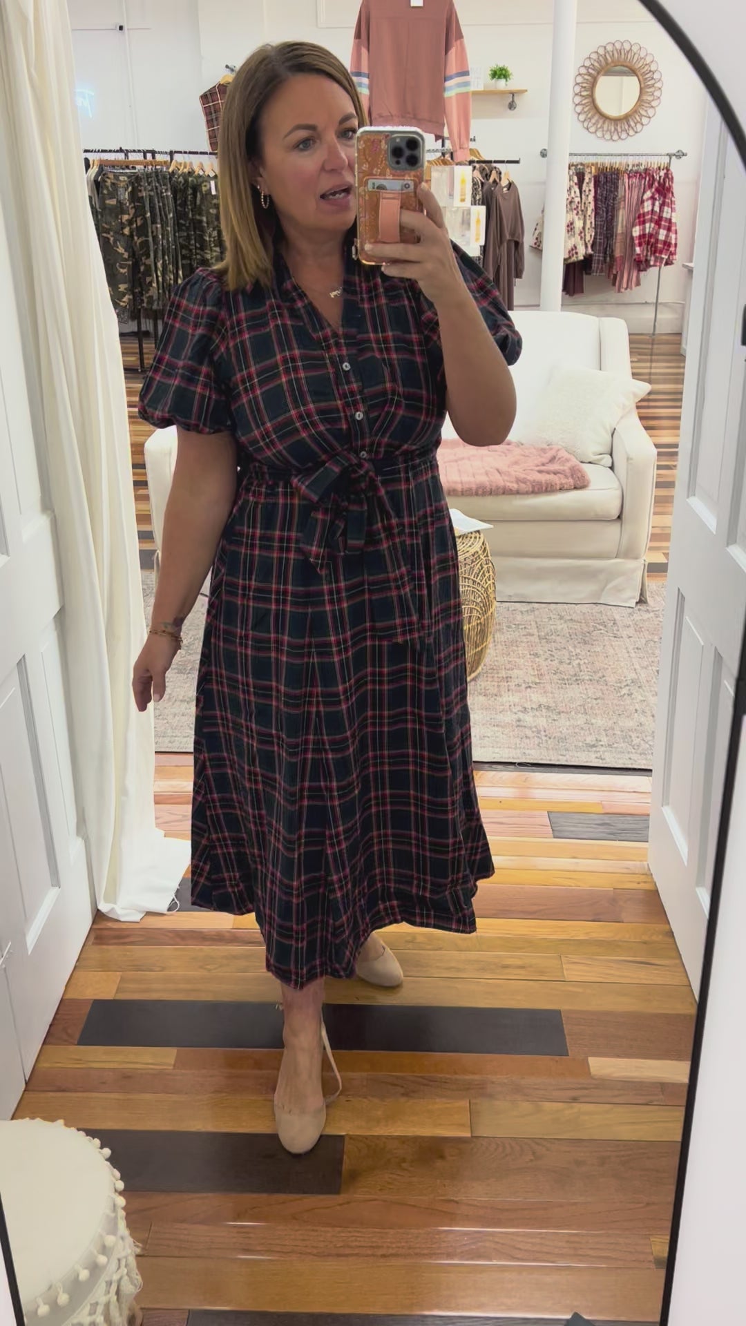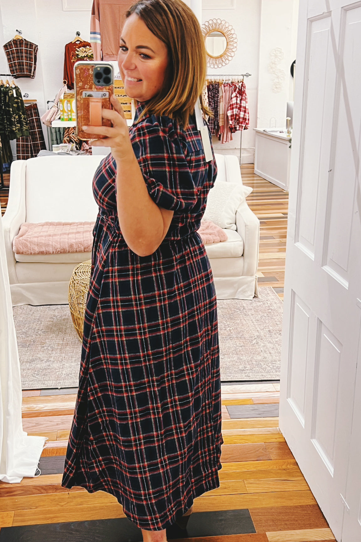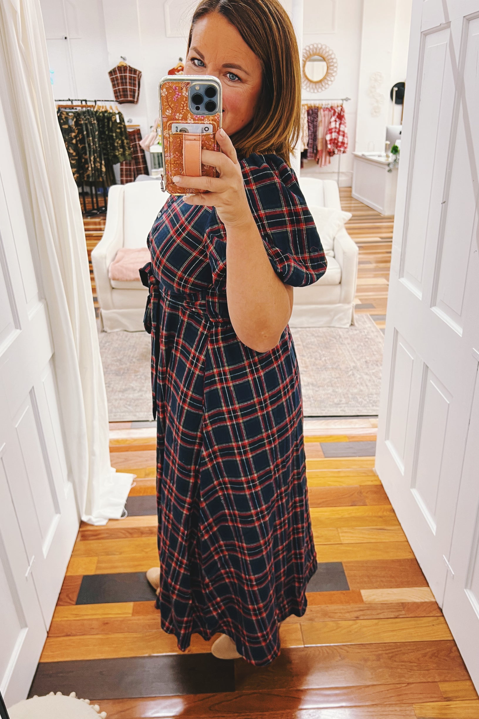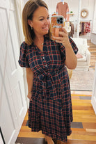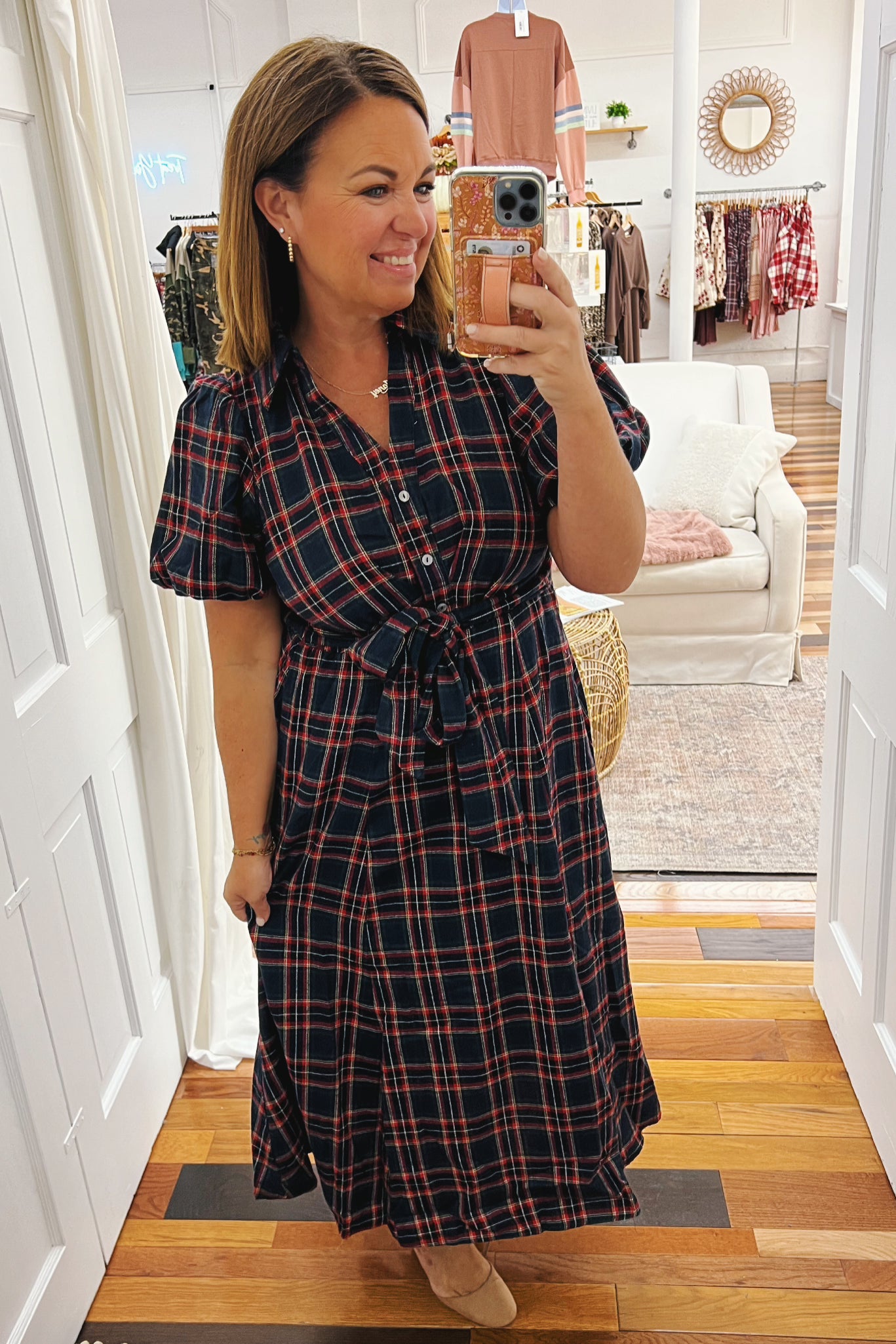 Get ready to receive all the compliments! The Maeve Plaid Midi Dress is your secret for looking effortlessly polished while feeling absolutely amazing. Dressed in classic navy tartan plaid, this midi features a flattering silhouette that photographs beautifully for church gatherings and family moments. The subtle V-neck adds just the right touch, while short bubble sleeves bring playful charm. So comfy you'll forget you're wearing anything special, yet refined enough to turn heads. This is the dress that makes you feel confident, comfortable, and undeniably lovely.
