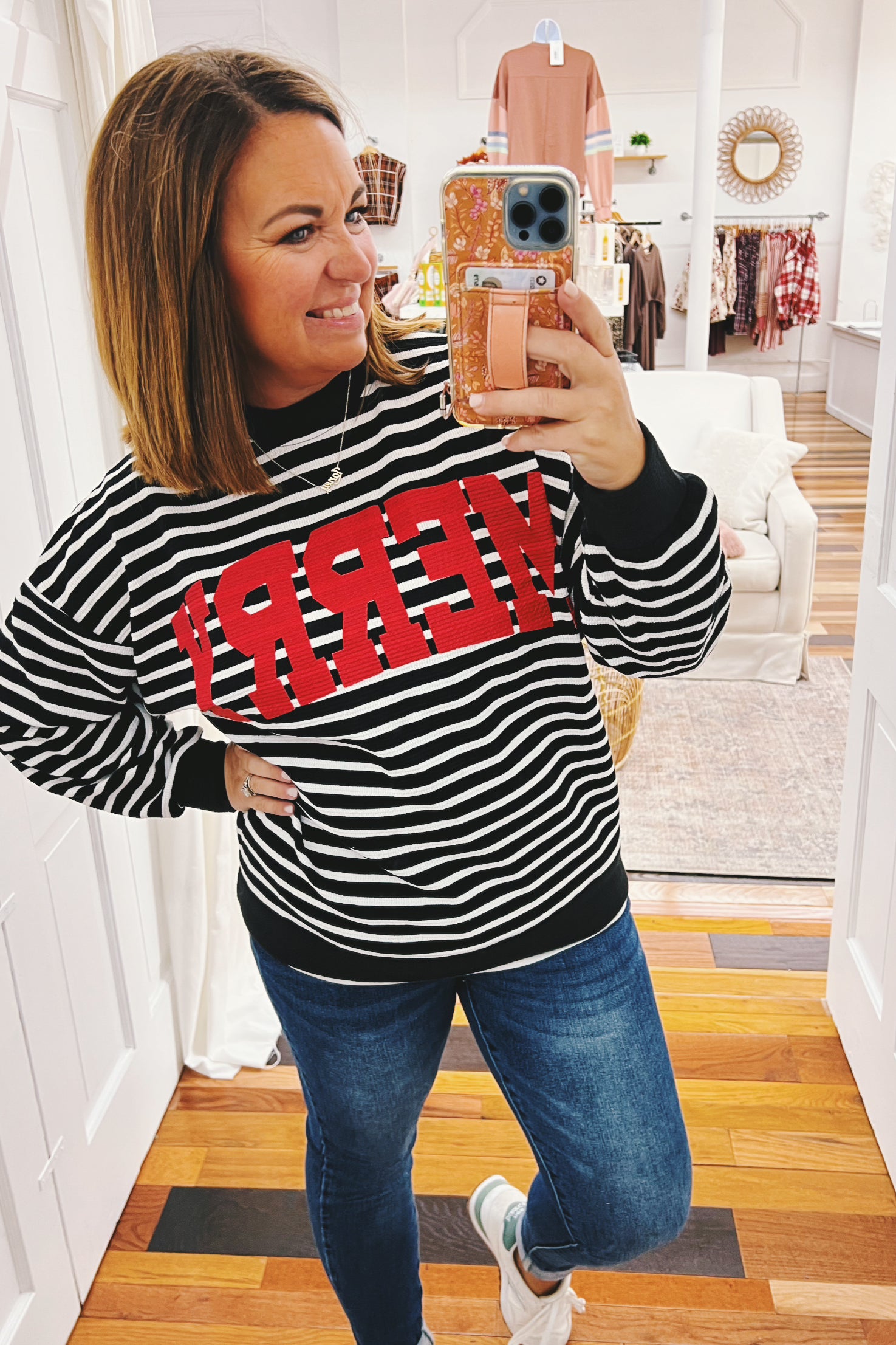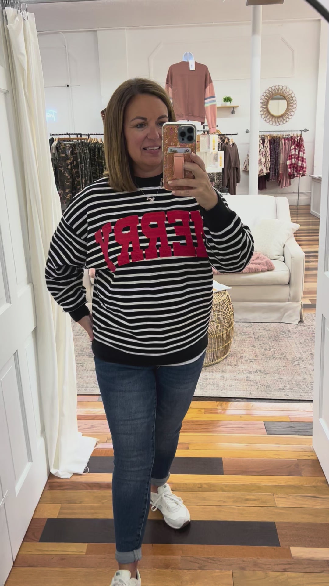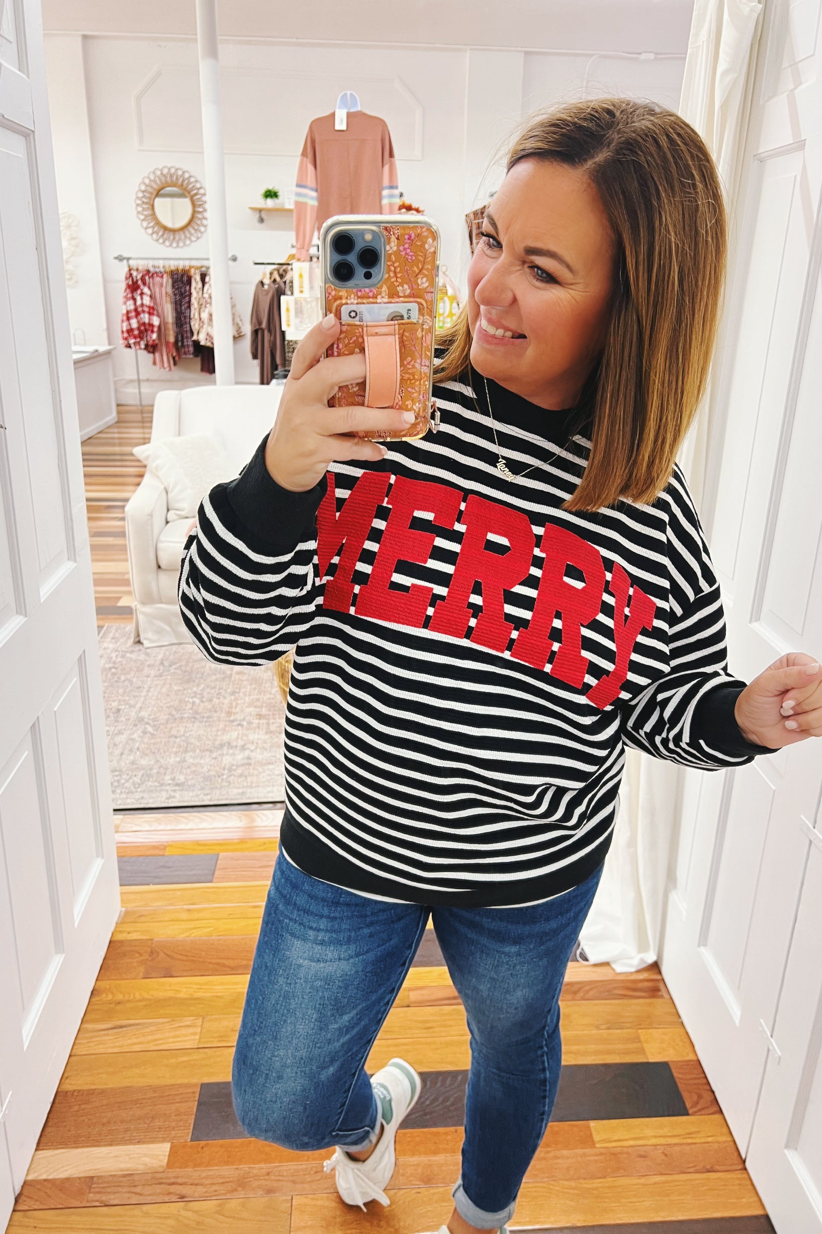 The Merry Striped Pullover is your ticket to being the cutest girl at your festive gathering. Classic black and white stripes form the perfect canvas for bold block red letters spelling MERRY across the chest—a statement that's equal parts festive and timeless. Comfy enough for lazy days yet cute enough to dress up for nights out, this pullover transitions seamlessly from casual to chic. The relaxed fit keeps you feeling cozy while the classic striped pattern ensures you'll reach for it season after season. Simple, playful, and undeniably versatile.