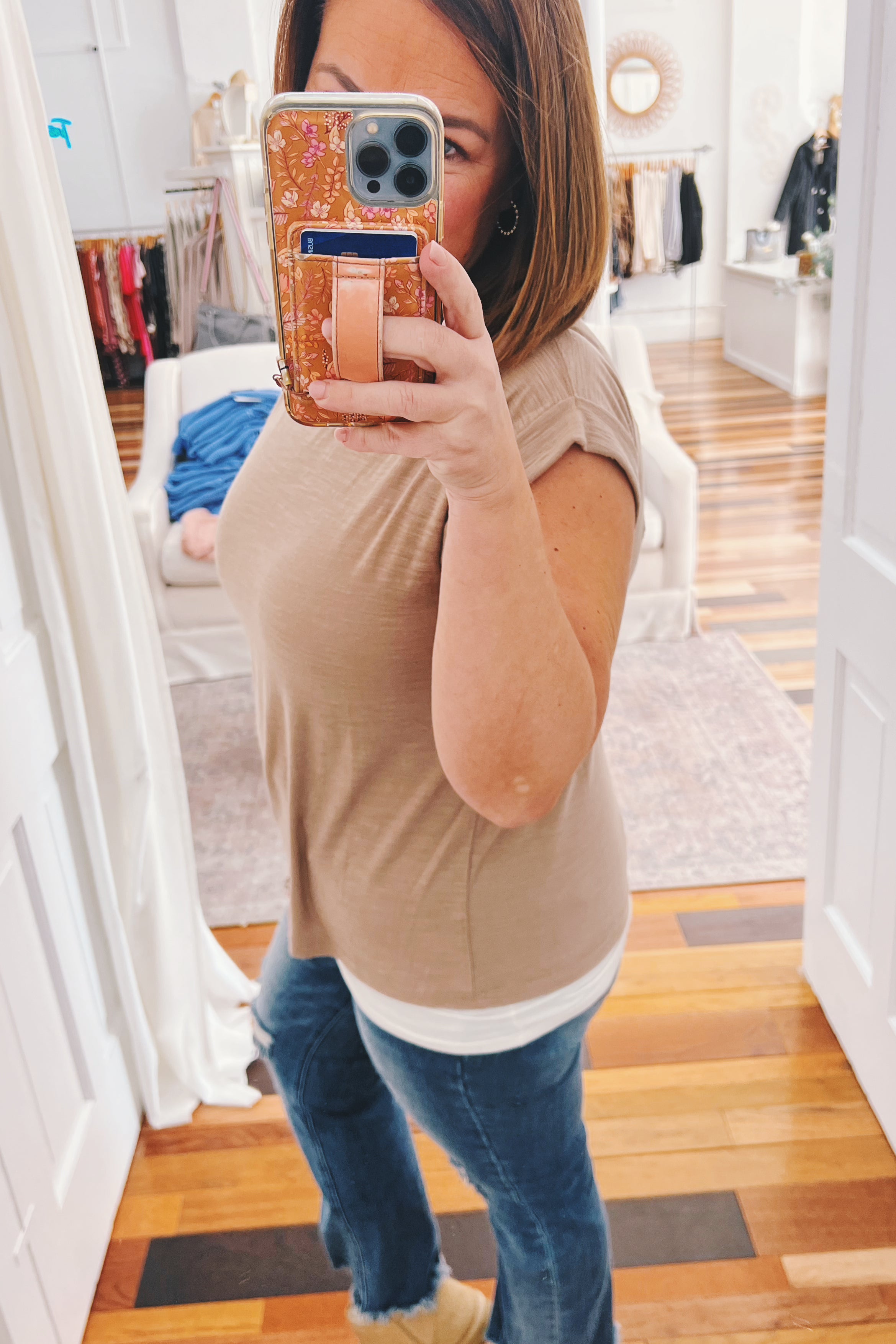 This mocha-hued tee is the versatile essential your wardrobe has been waiting for. The textured slub knit adds subtle dimension while keeping things beautifully simple. Soft and stretchy fabric hugs you in all the right ways, and the cuffed short sleeves bring a polished touch to the relaxed fit. Layer it under jackets and cardigans as the seasons shift, or let it shine solo on warmer days.