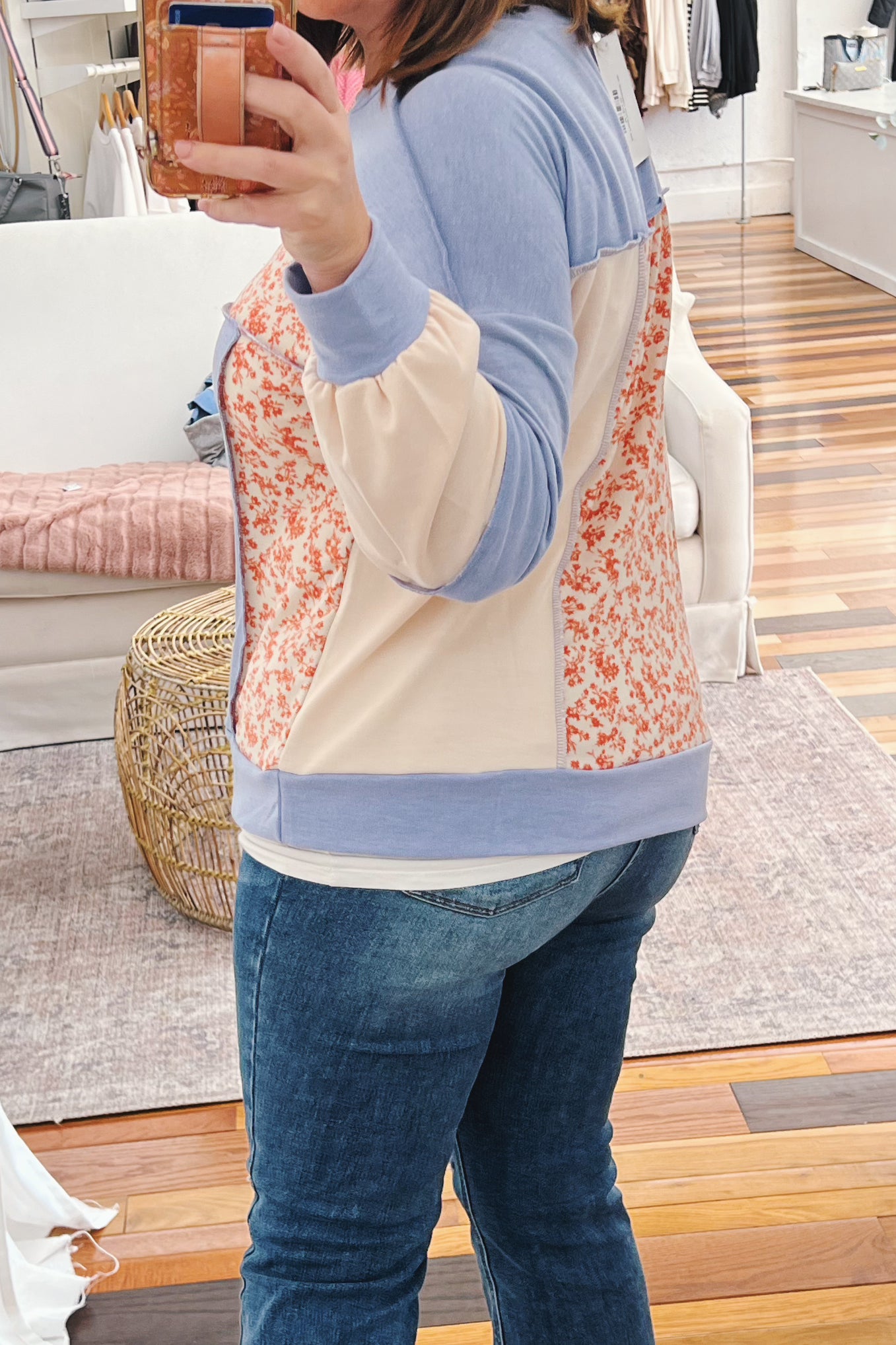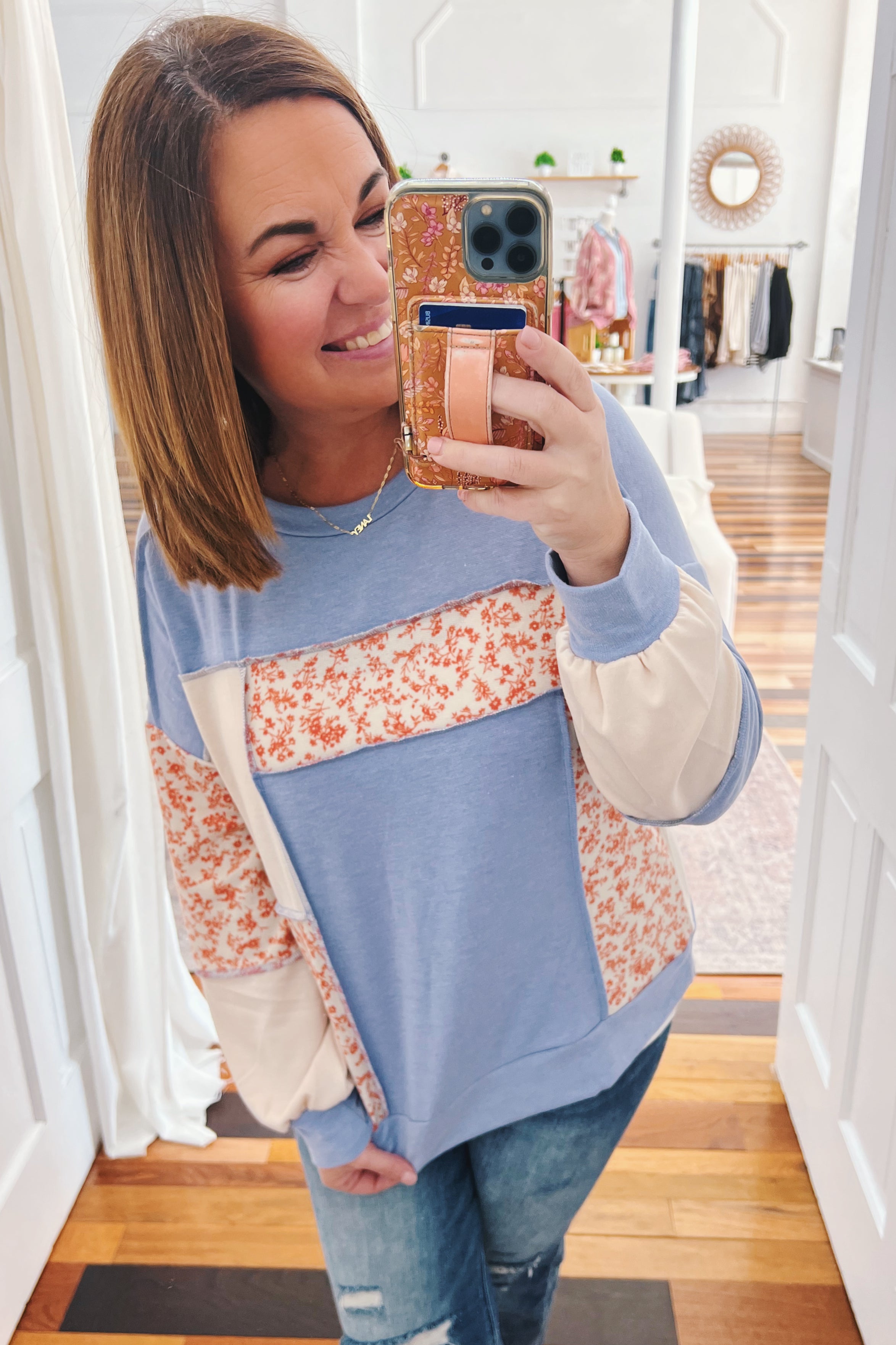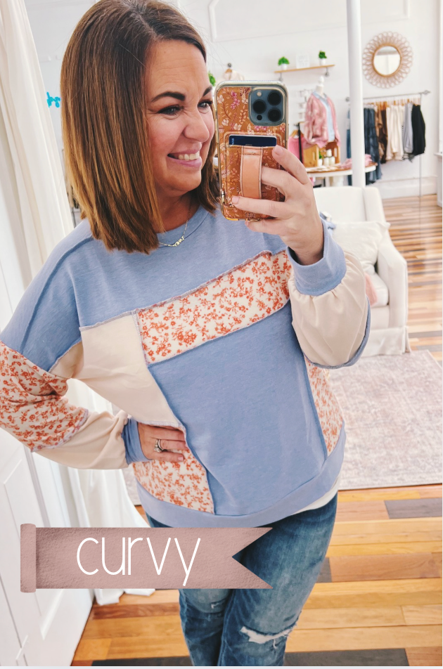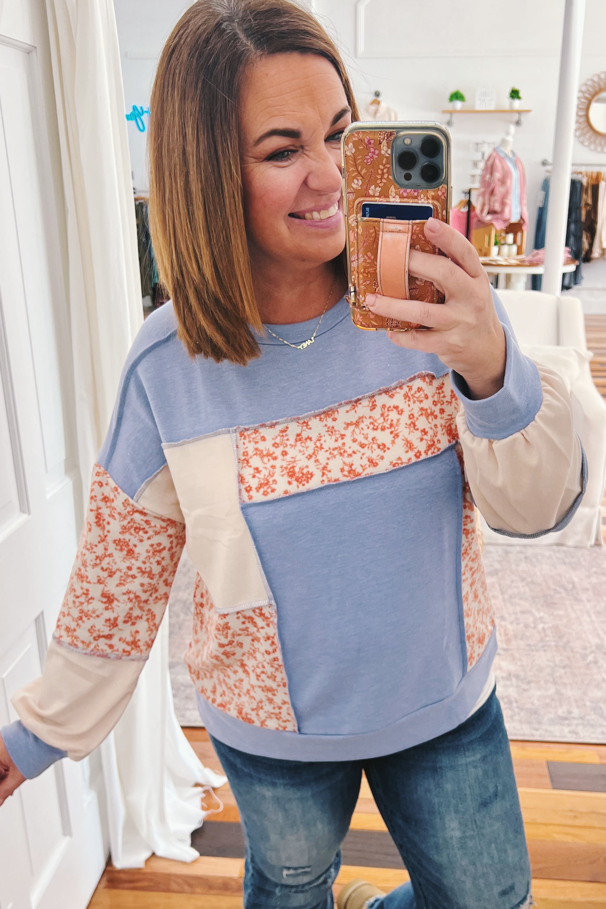 Throw on this effortless colorblock top and embrace the art of doing absolutely nothing—stylishly. Featuring a playful mix of soft blue, coral, and tan in a bold print block design, it's basically wearable comfort. The brushed knit fabric feels like a cozy hug, while exposed seams add an intentional, modern edge. With its slouchy relaxed fit, you'll feel like you're wearing your favorite oversized sweater all day long. True to size and ready for everything from coffee runs to weekend hangs.
