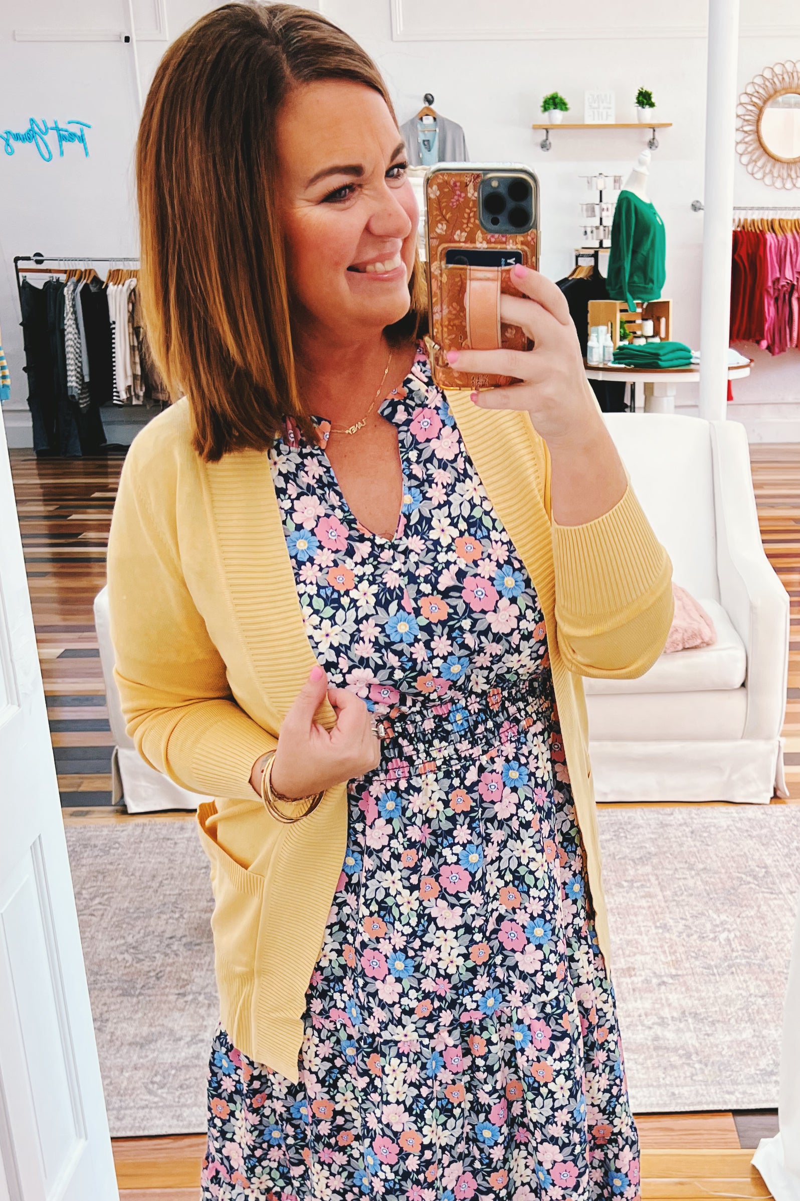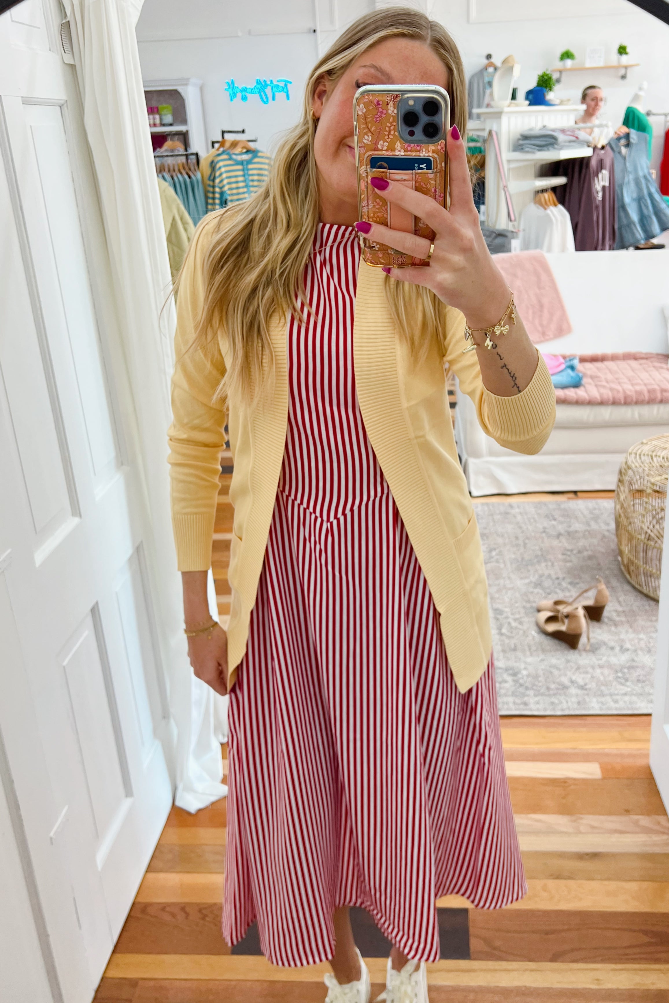 The Polly Ribbed Open Cardigan is spring's sweetest layer! In a soft butter yellow that practically sings, this piece hits right at the thigh for a flattering, modern silhouette. The slim fit skims your frame beautifully while the silky-stretchy fabric moves with you in all the right ways. Throw it over a dress, a tee, or your favorite spring top. Perfect for Easter gatherings, garden parties, or any moment that calls for a touch of cheerful cozy.