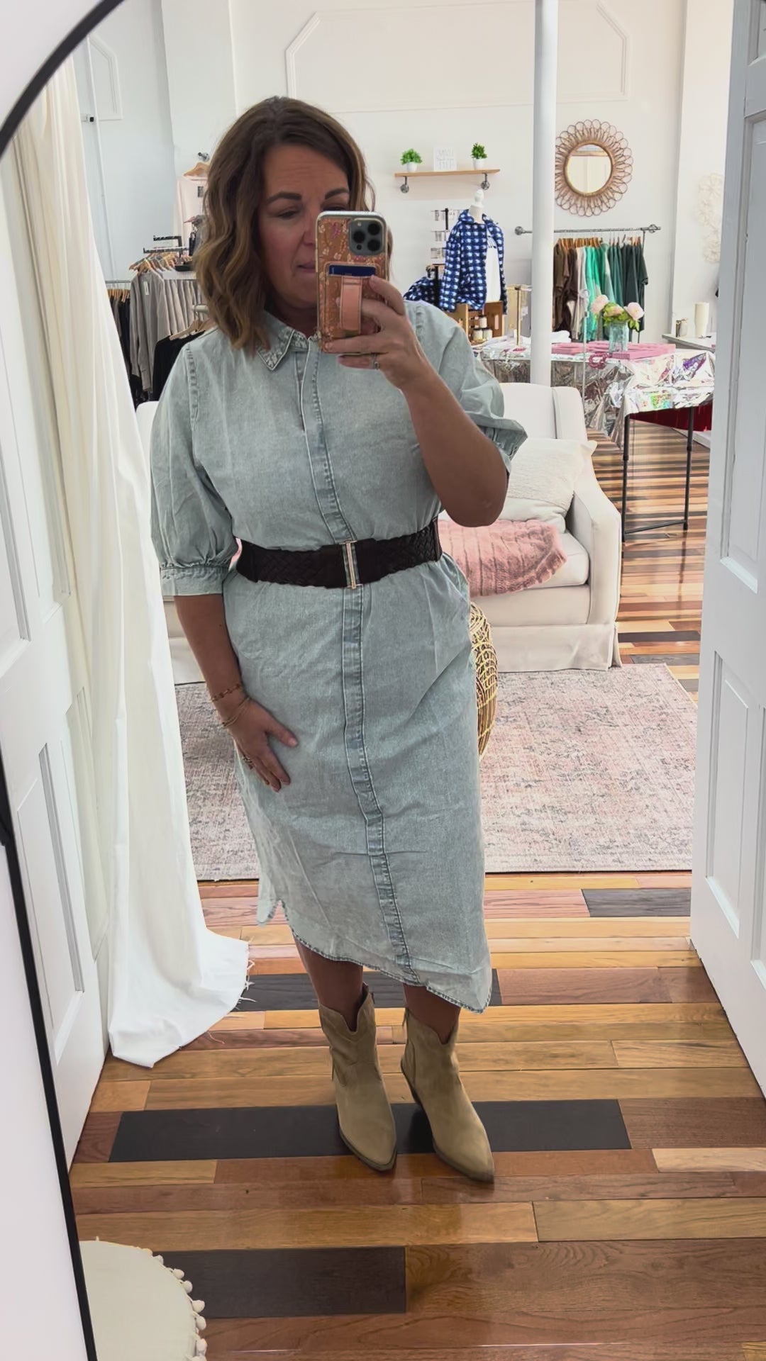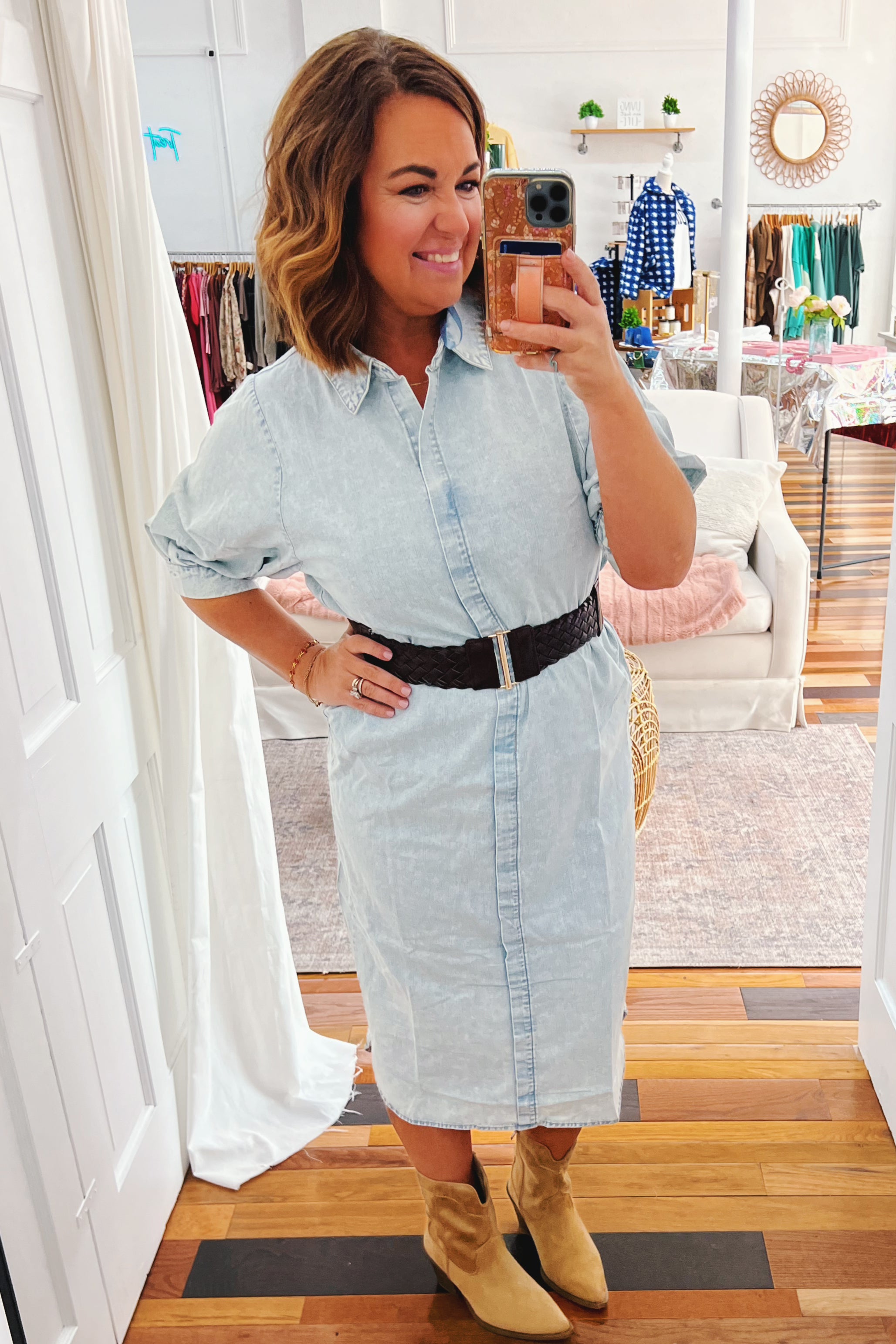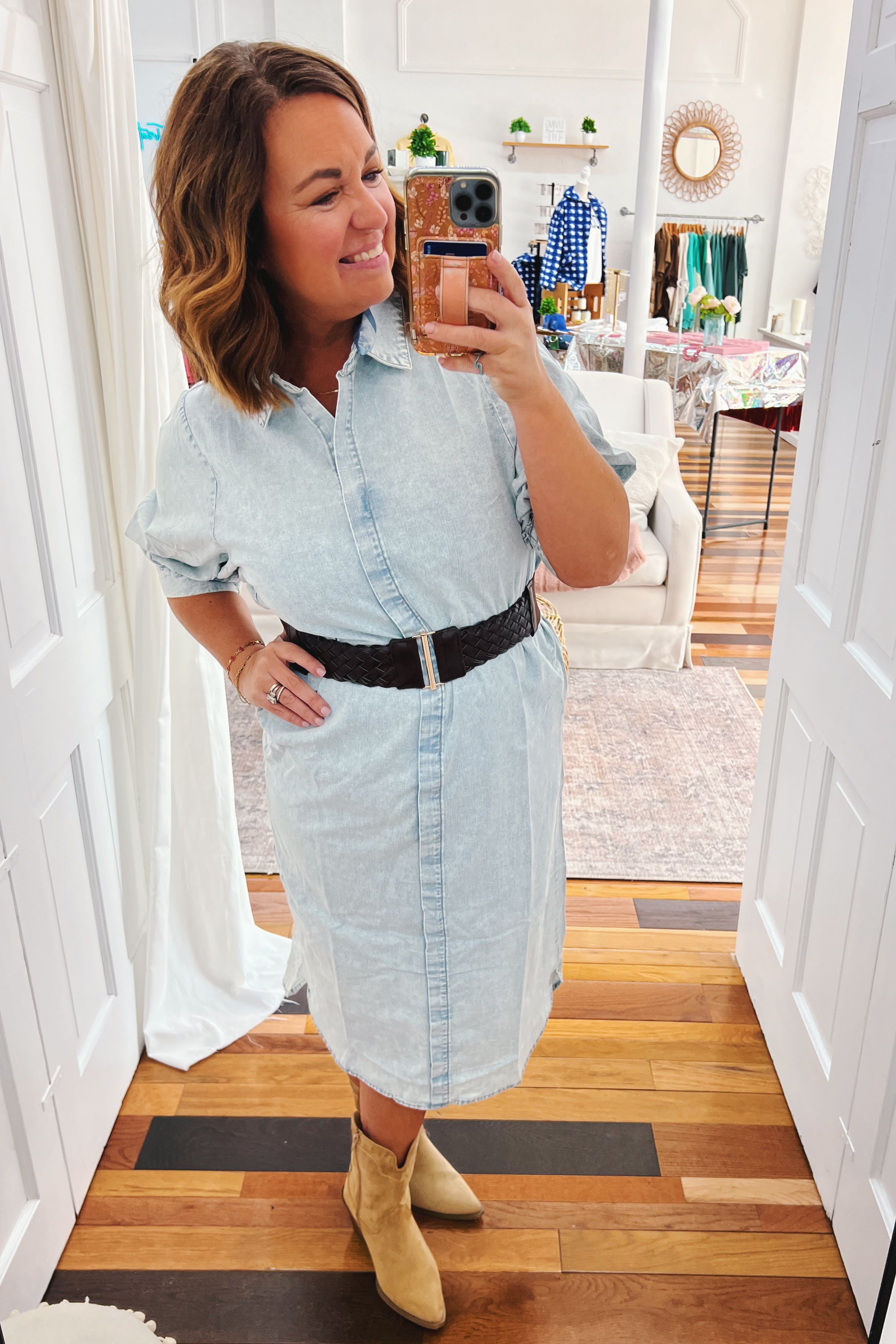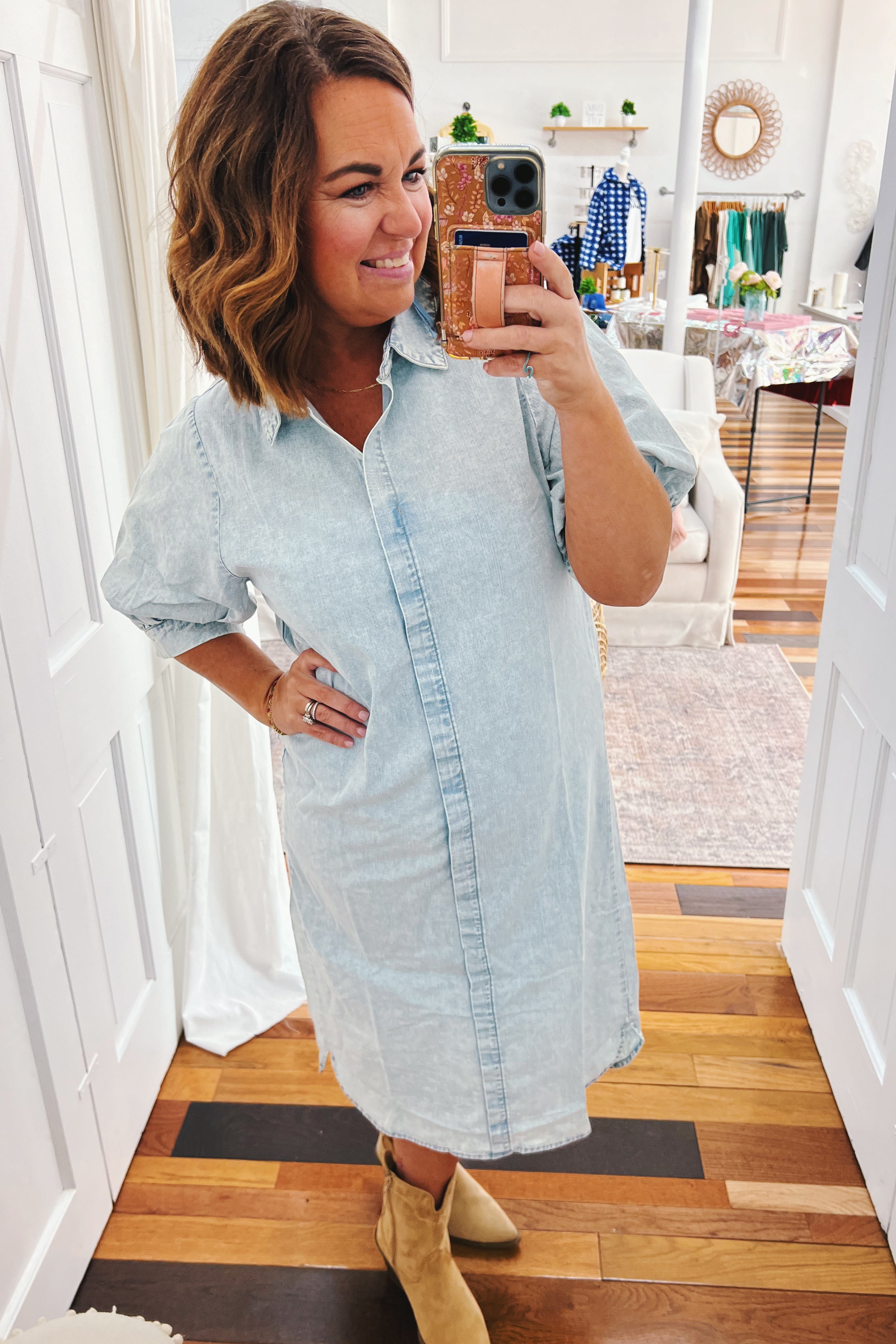 Meet Priscilla, the timeless chambray midi dress that proves classics never go out of style. This structured beauty features a crisp, non-stretch fabric that holds its shape beautifully, with a flattering front seam that creates subtle definition. Half bubble sleeves with cuffed edges add a charming vintage touch without trying too hard. The relaxed shift silhouette skims your frame, making it equally at home at brunch or running errands. Wear it straight or add a belt and sweater to complete the look