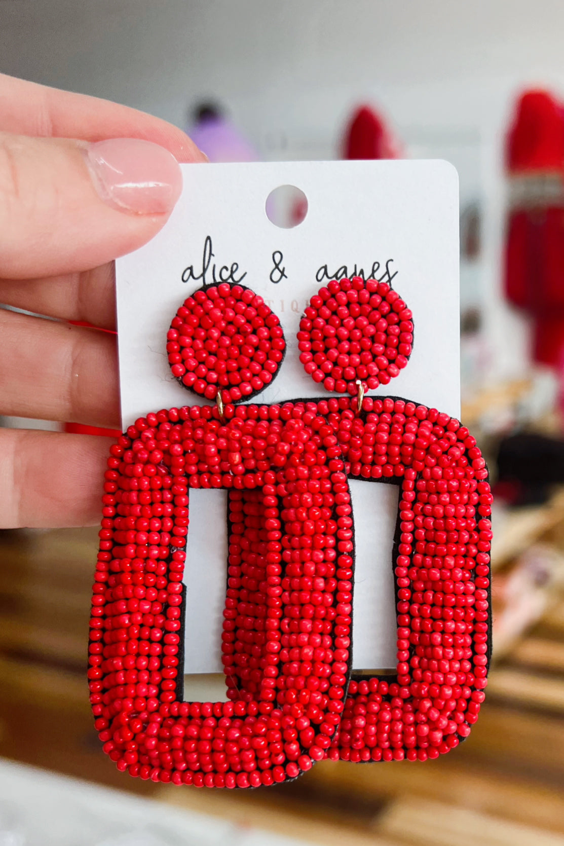 Make a bold statement with these oversized red seed bead earrings featuring a striking rectangular shape. These eye-catching dangles bring serious style without the serious weight—perfect for when you want your accessories to do the talking. Whether you're channeling retro vibes or modern edge, these vibrant beauties add instant personality to any outfit. Go big, go red, go fabulous.