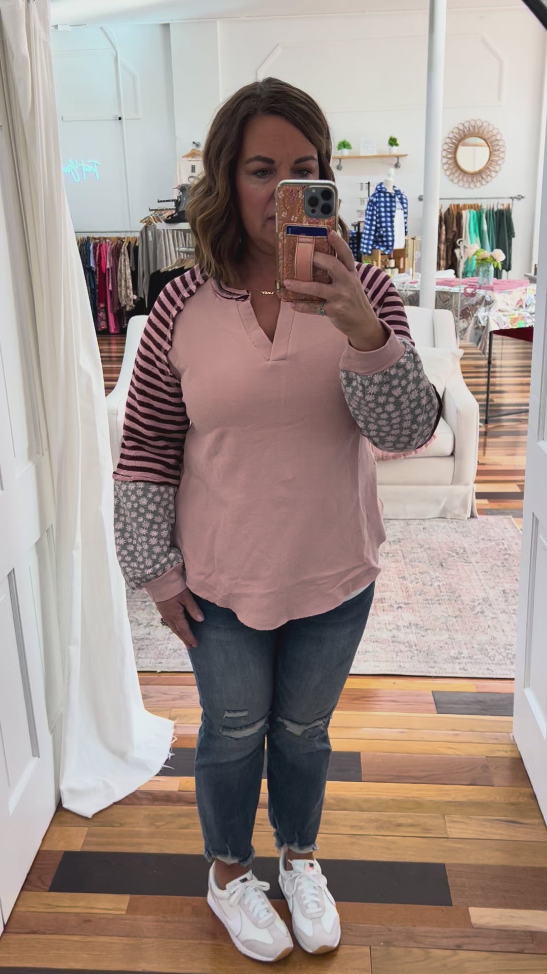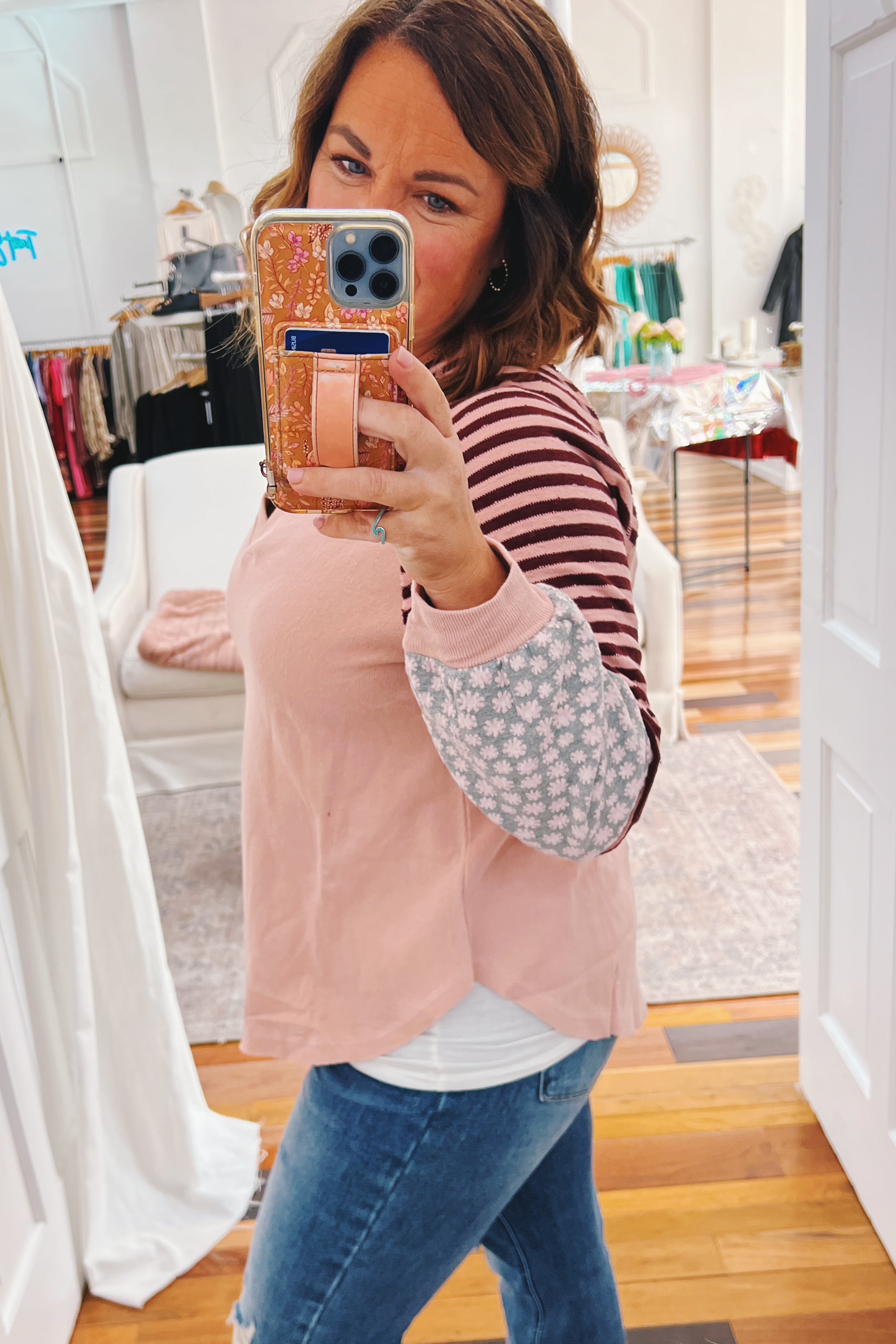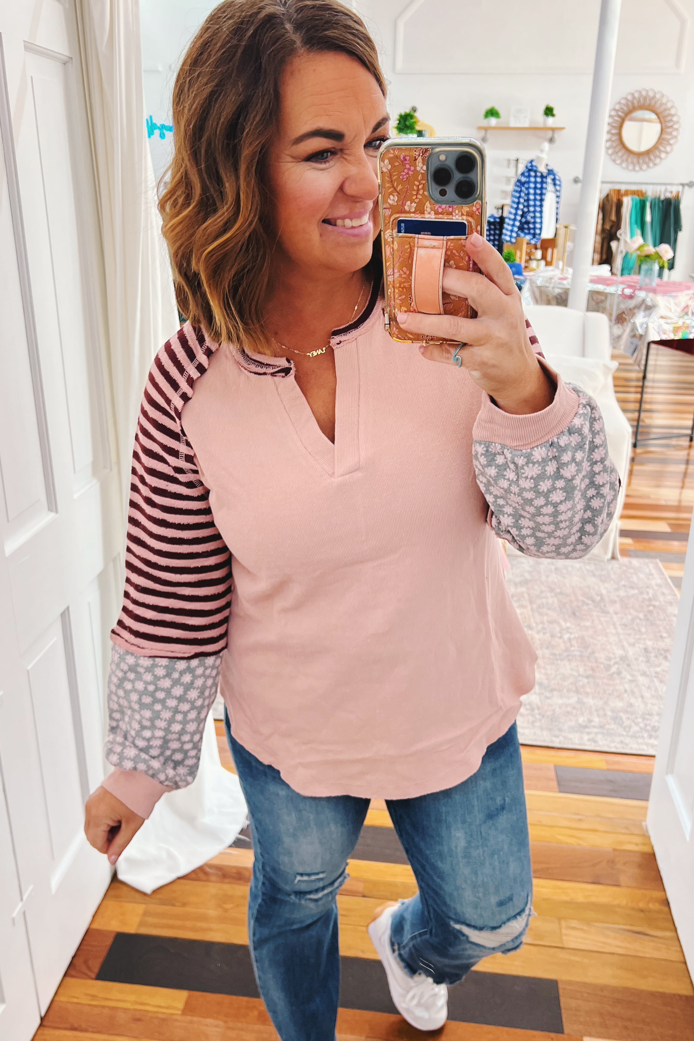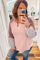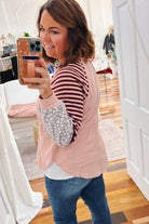 - mauve french terry top with colorblock sleeves
