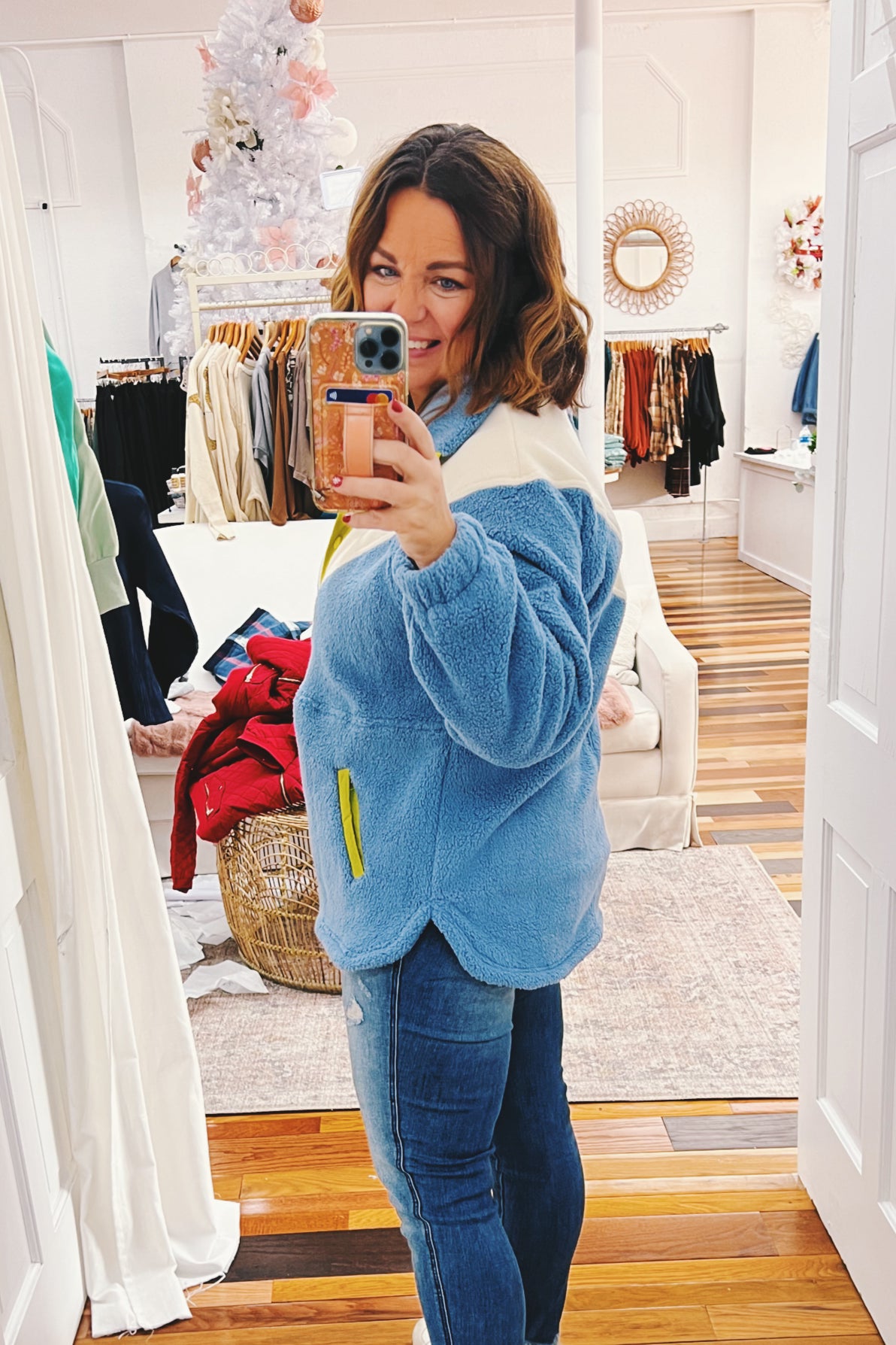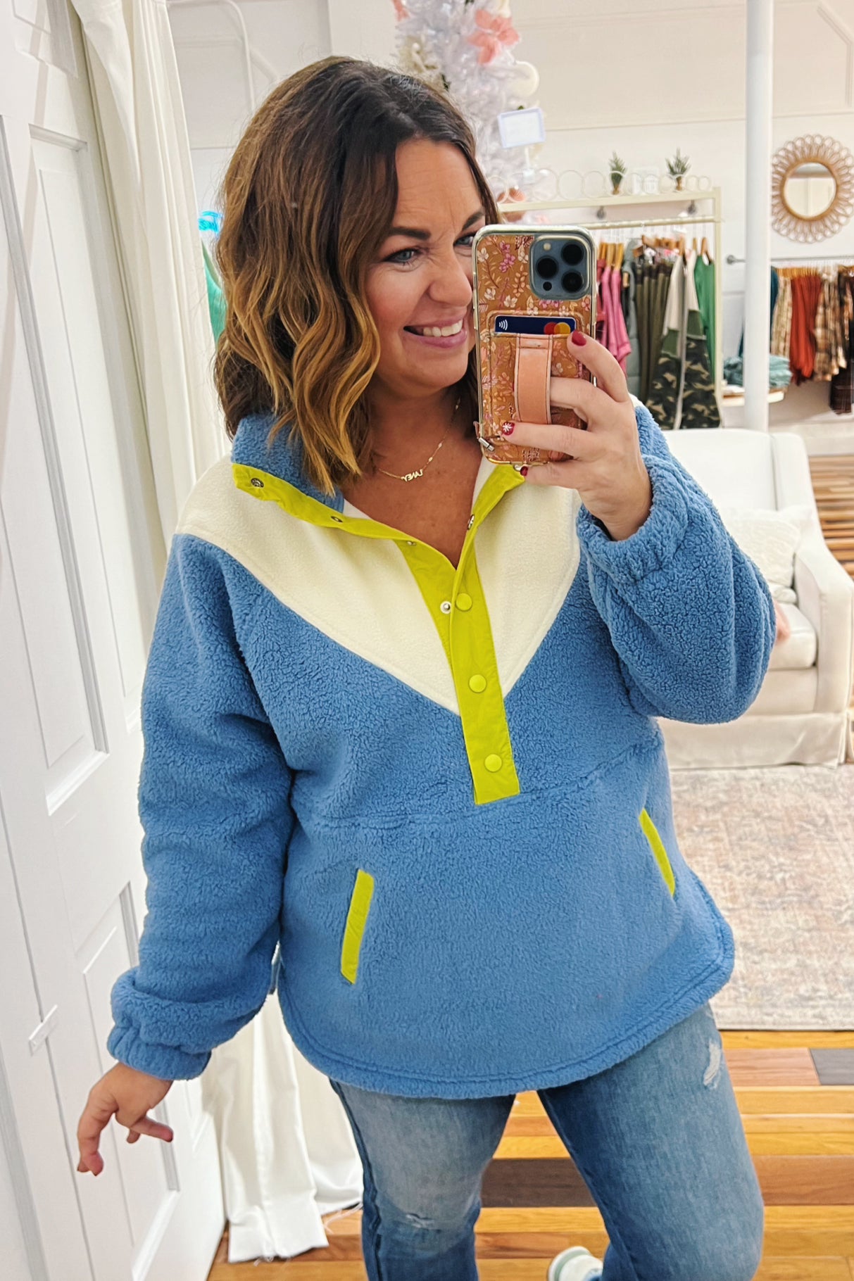 Wrap yourself in comfort with the Rosalie Fleece 1/4 Snap Pullover, featuring a soothing periwinkle blue base accented with vibrant neon yellow trim. Made from our favorite super soft fleece, this pullover delivers exceptional warmth and coziness perfect for chilly days. The functional kangaroo pocket keeps your hands warm and essentials within reach. Whether you're lounging at home or stepping out for casual adventures, this pullover combines style and comfort in one irresistible package.