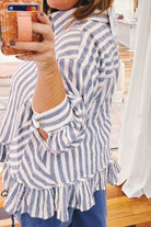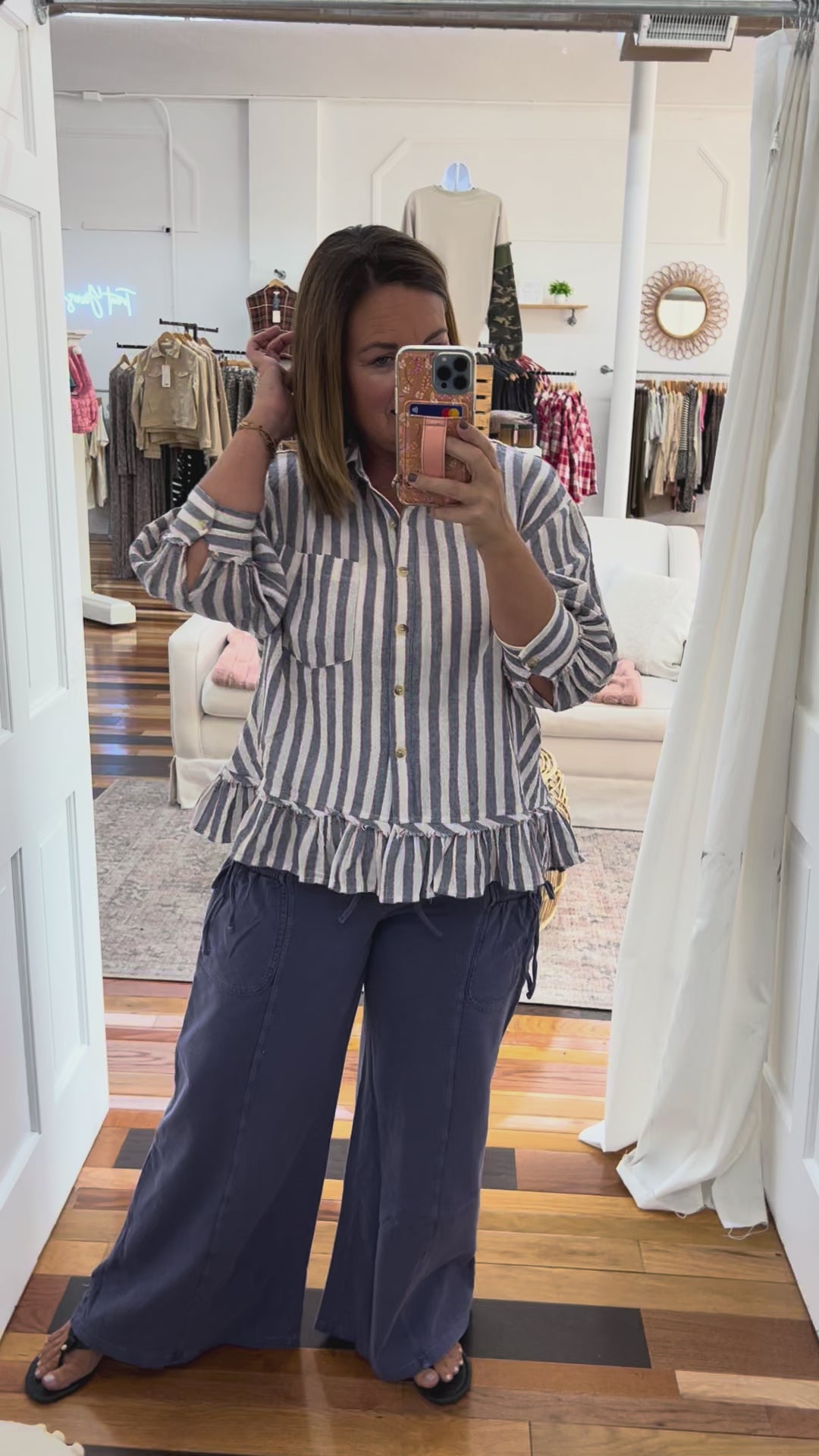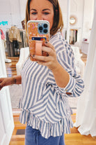 Embrace easy boho vibes with a classic twist in the Sarah Striped Ruffle Top. Featuring cream and blue stripes, 3/4 sleeves with button cuffs, and a playful ruffle hem, this oversized woven top is perfect for dressing up or down with effortless style. We love it paired with our wide leg french terry pants