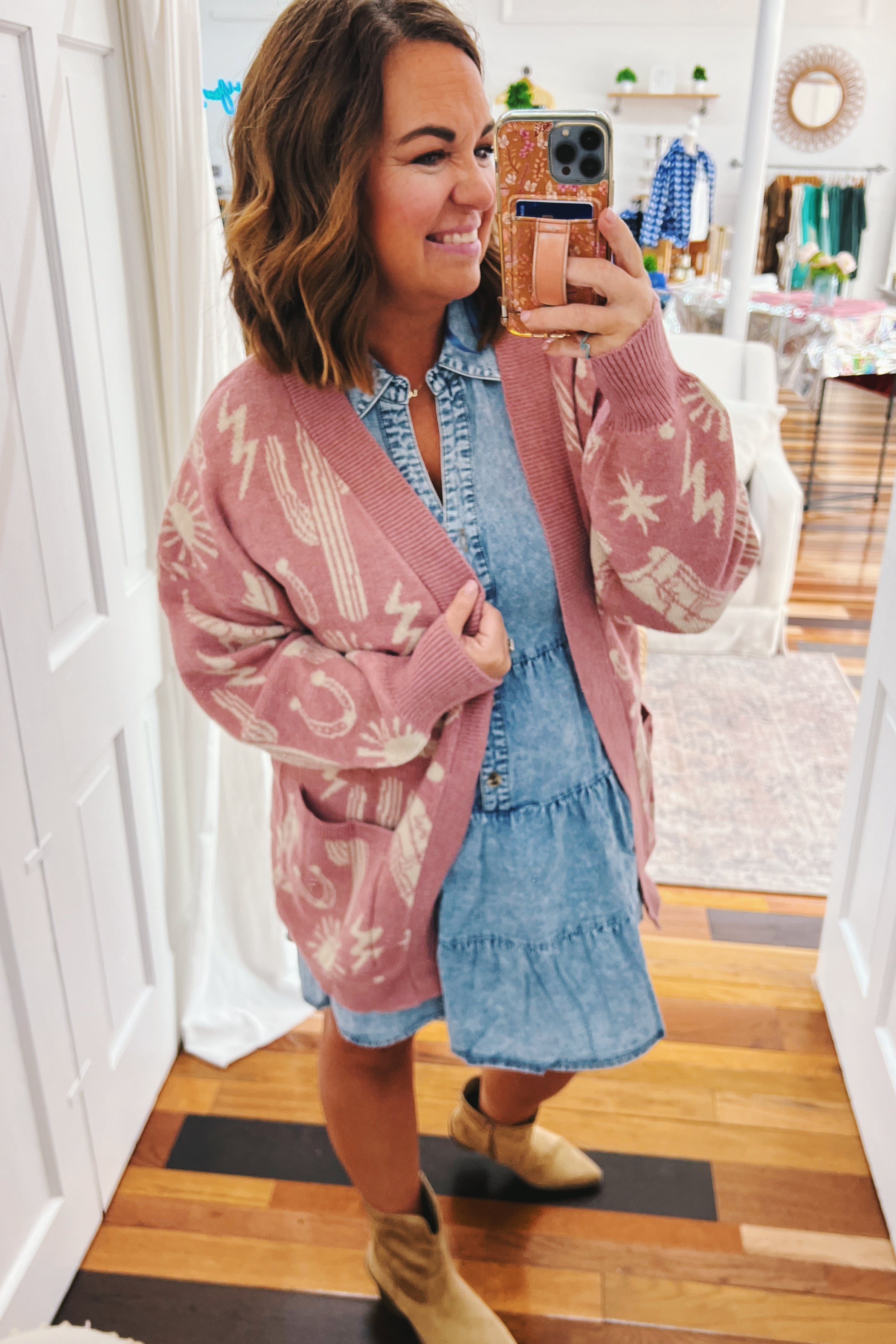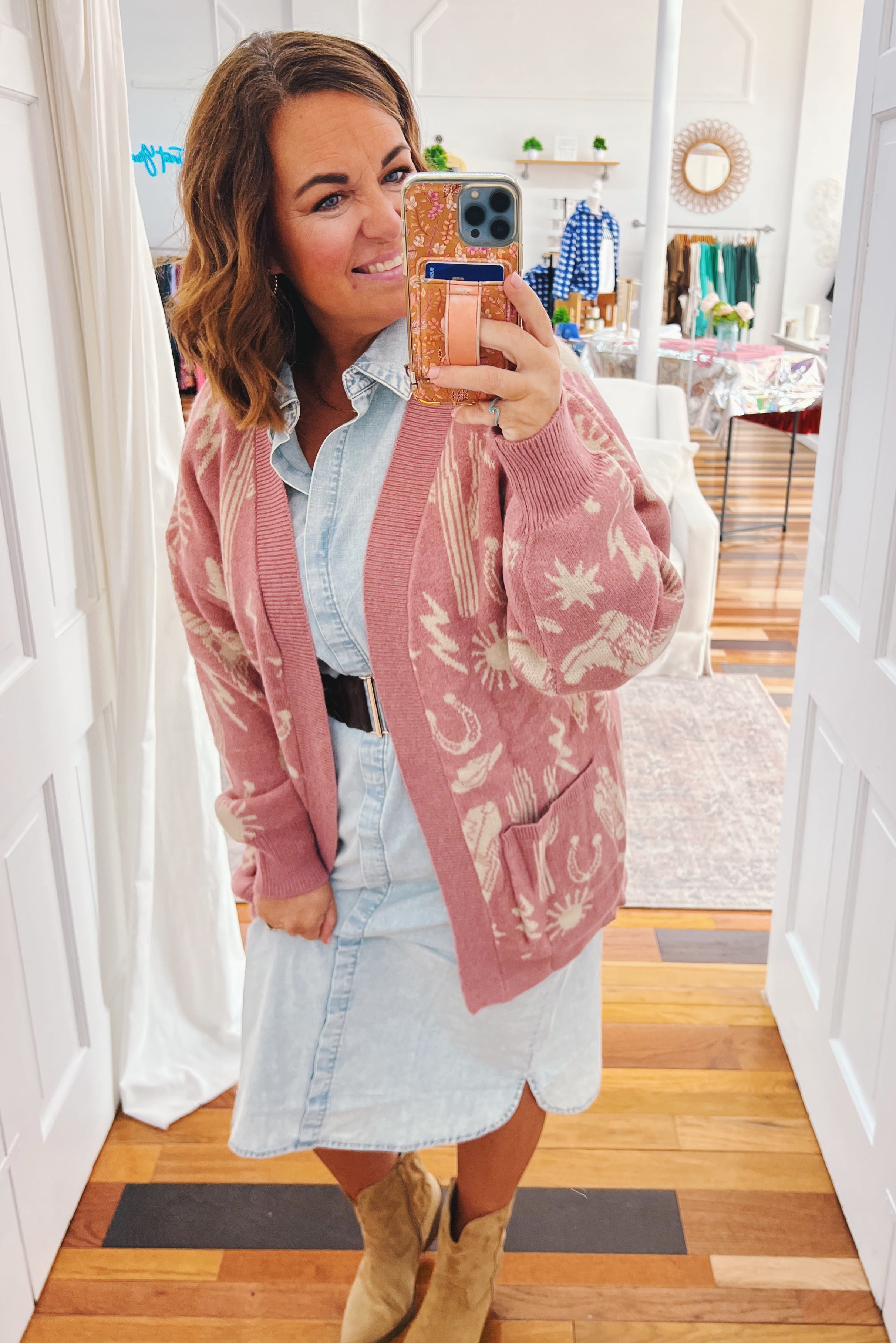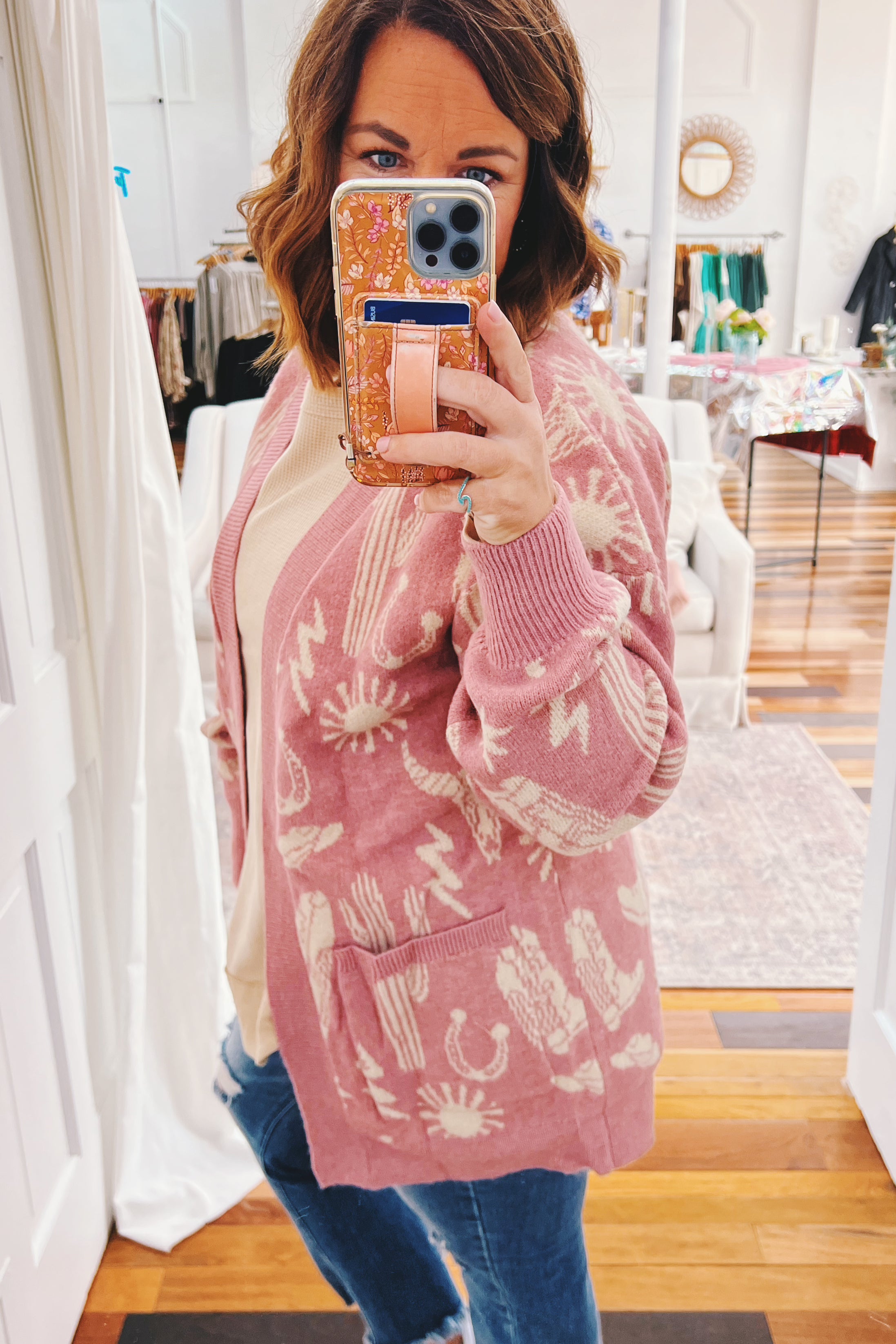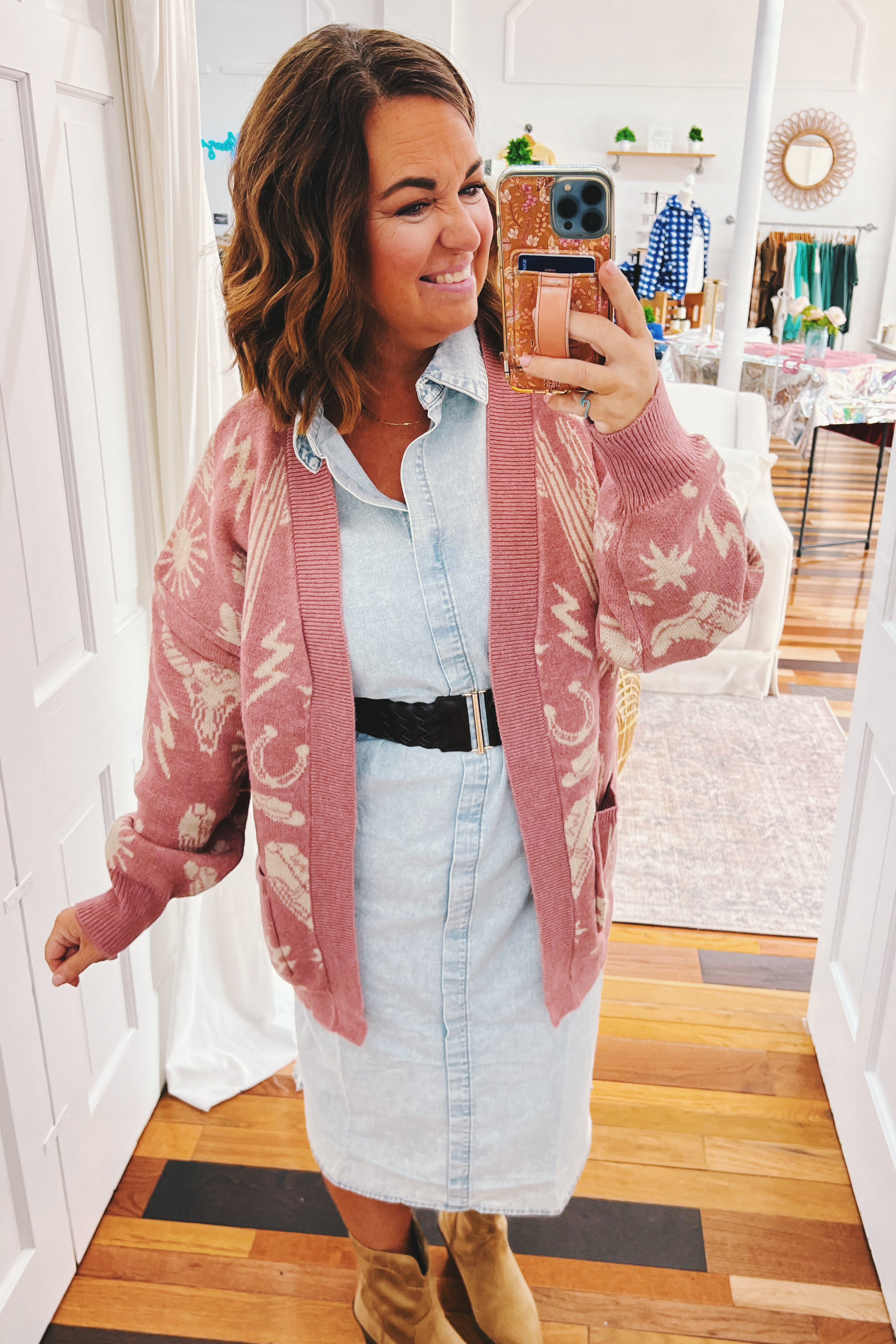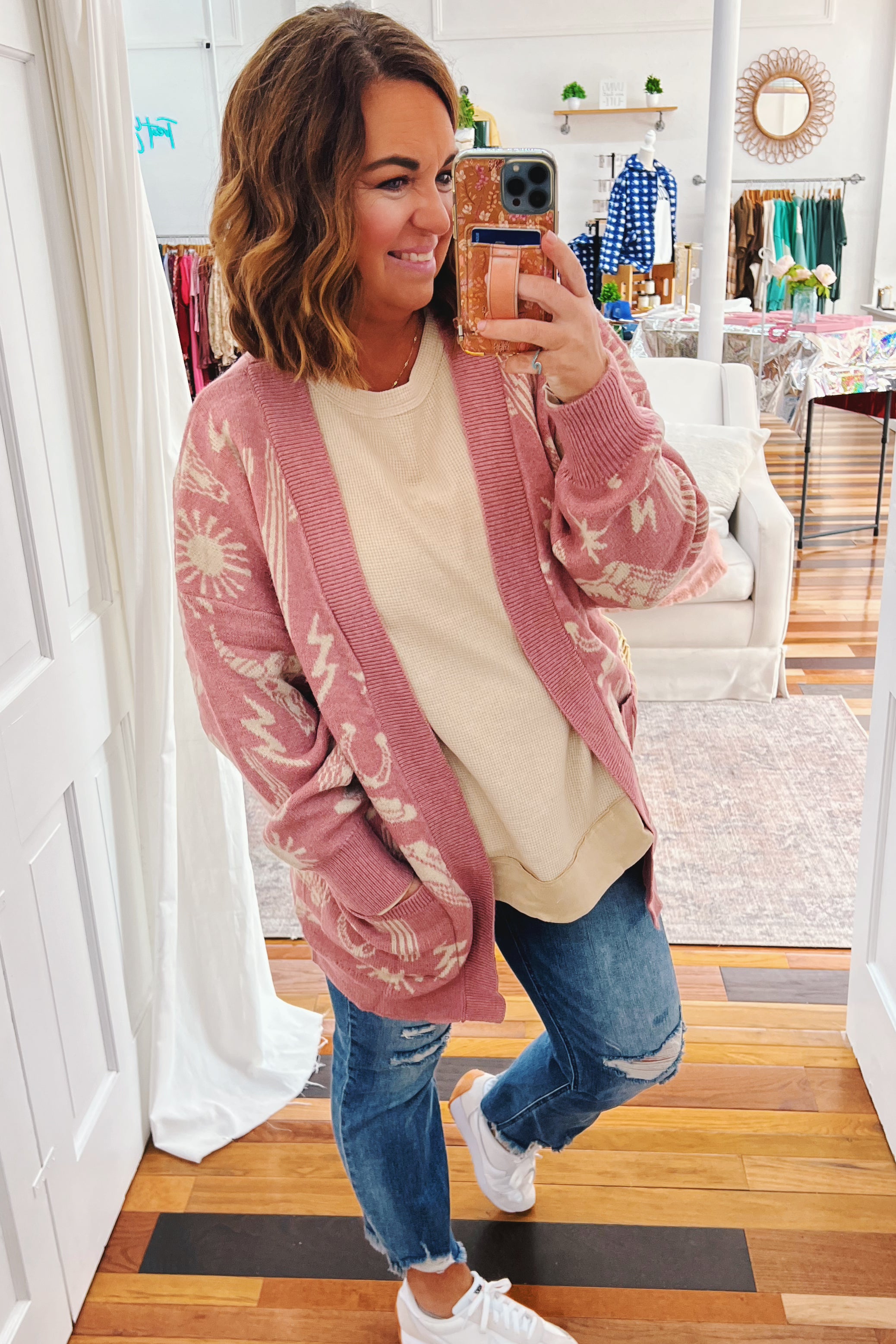 Meet Alaina, the cardigan that brings Western flair to your everyday rotation. This oversized mauve knit features a bold western print that is perfectly on trend. Soft, stretchy fabric keeps you cozy while the oversized fit keeps things comfortable. The open front design lets you layer it however you like, and functional front pockets are perfect for keeping essentials close. Throw it over a tee, dress it up with a chambray dress.