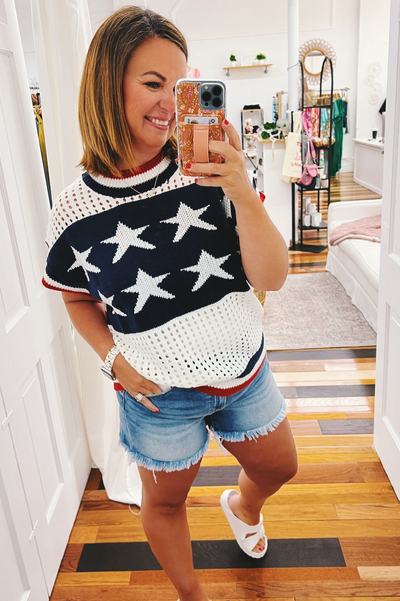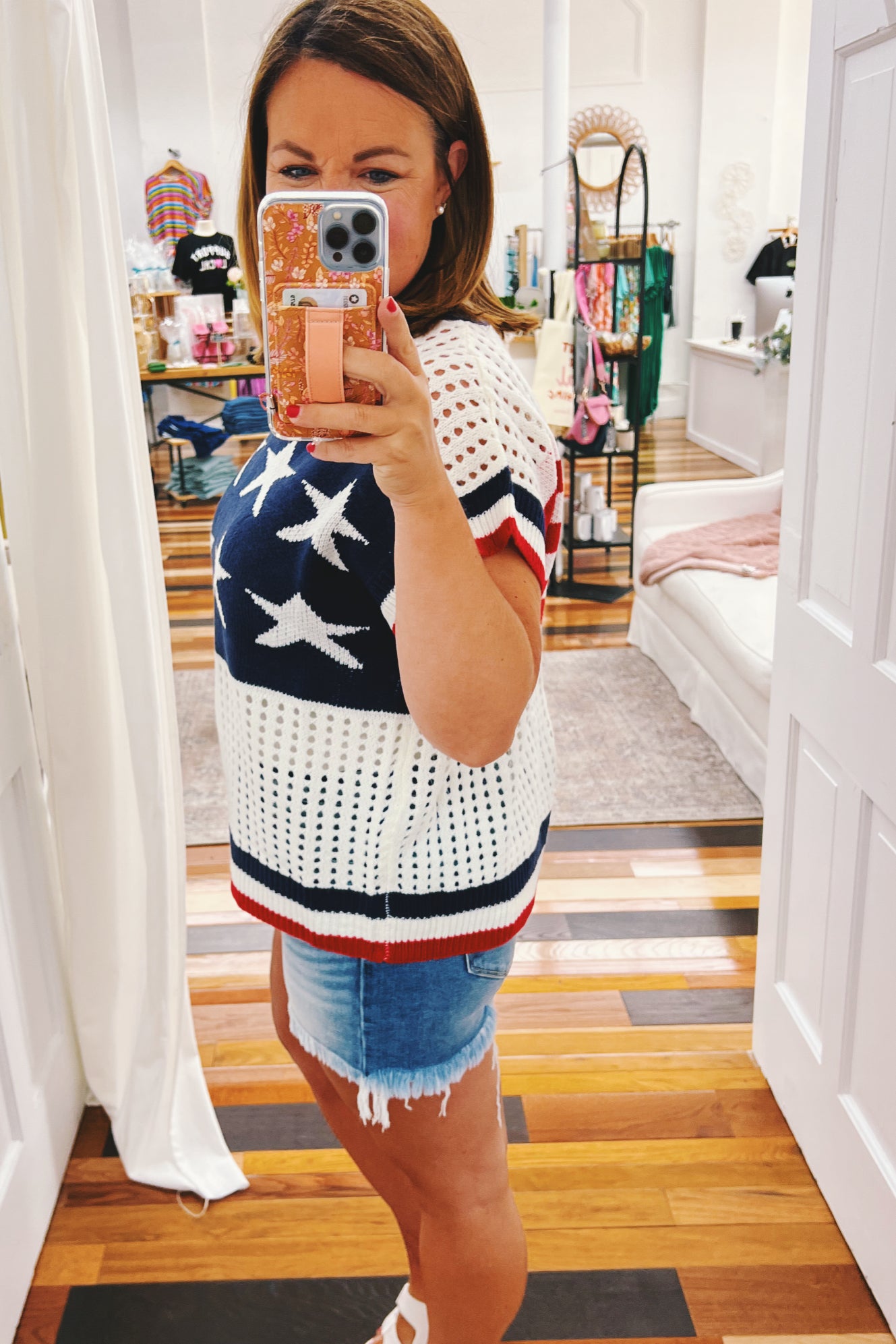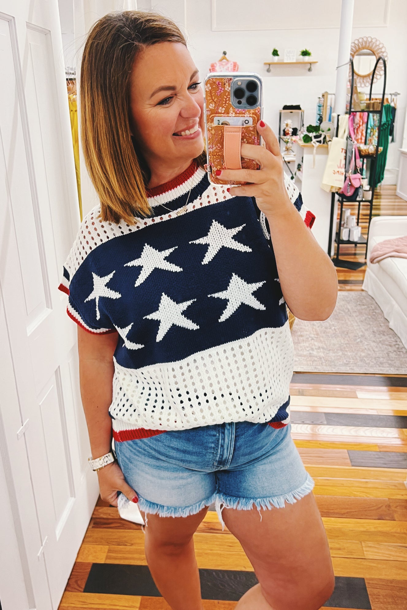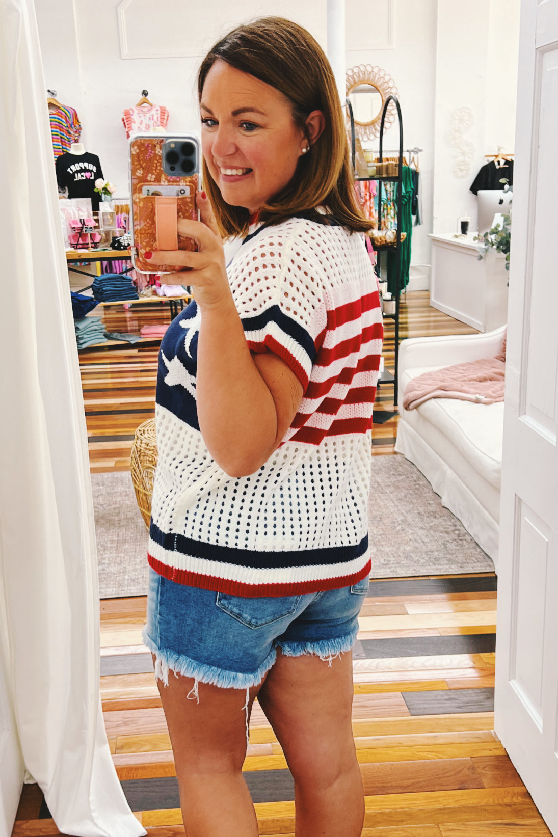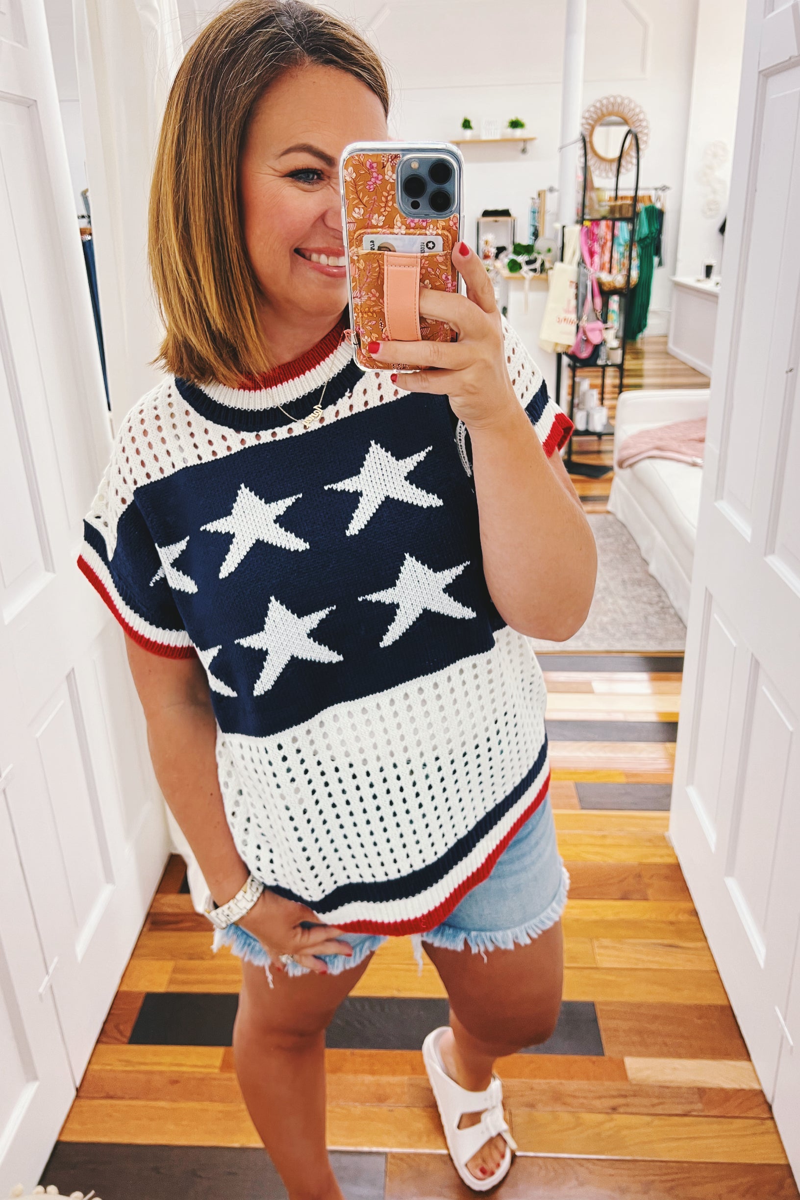 Party in the USA with our Amelia Stars & Striped Netted Sweater! This playful summer knit features a bold blue star design up front and sassy red stripes in the back—adorable! The boxy cut gives you room to move while the sleeveless style keeps you cool during fireworks and festivities. Those cheeky netted accents add just the right amount of peek-a-boo fun 🤩 You can easily dress this one up for work, too. So versatile and fun!