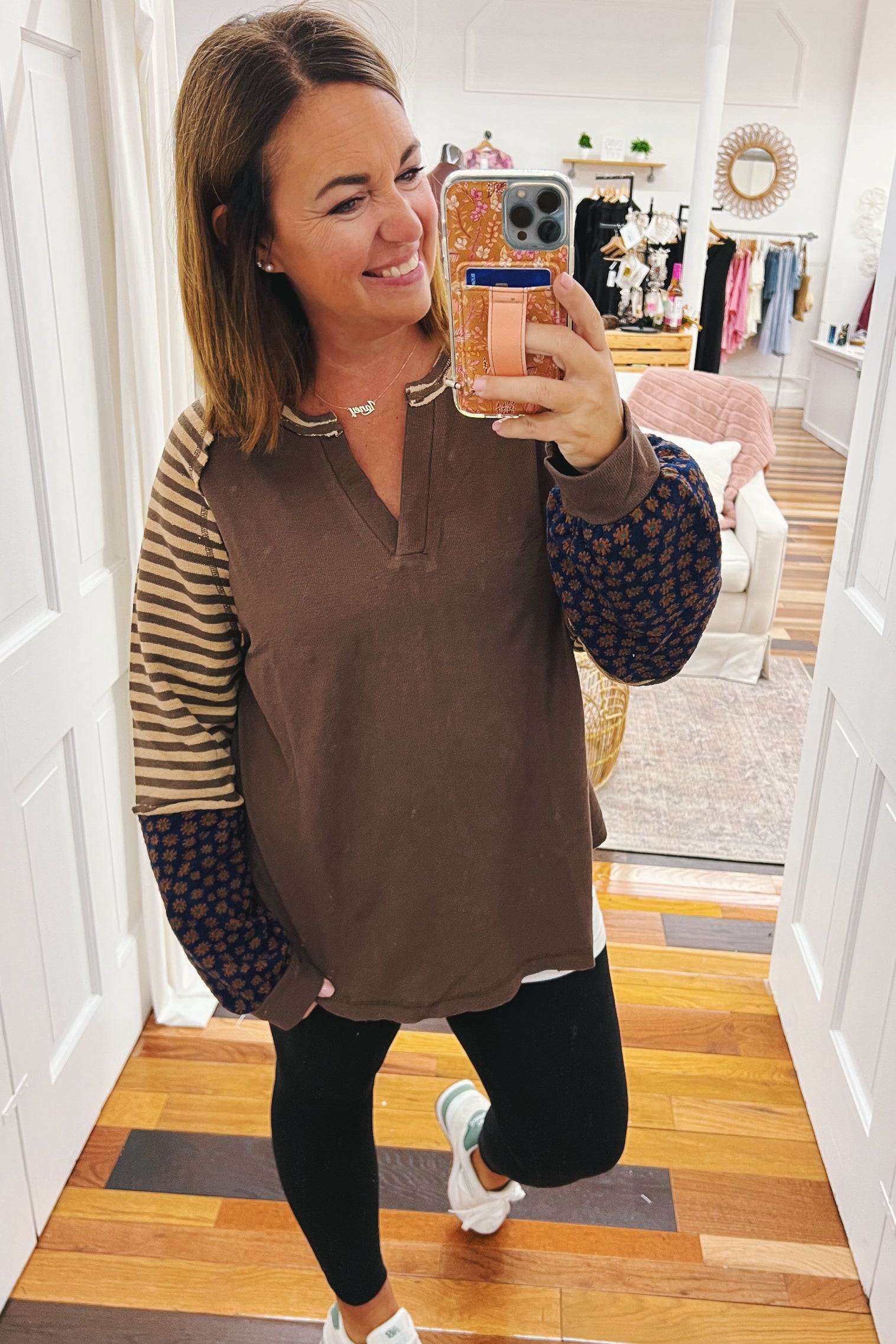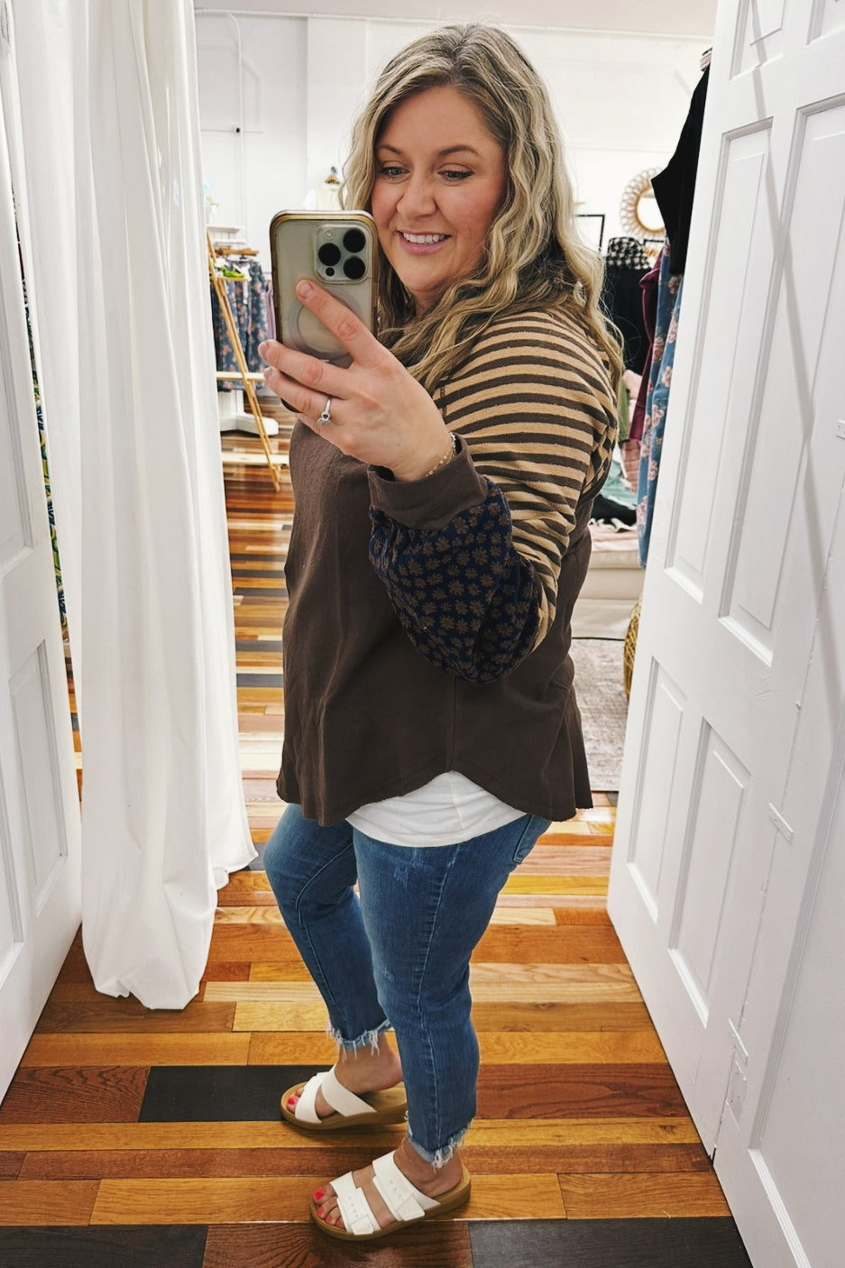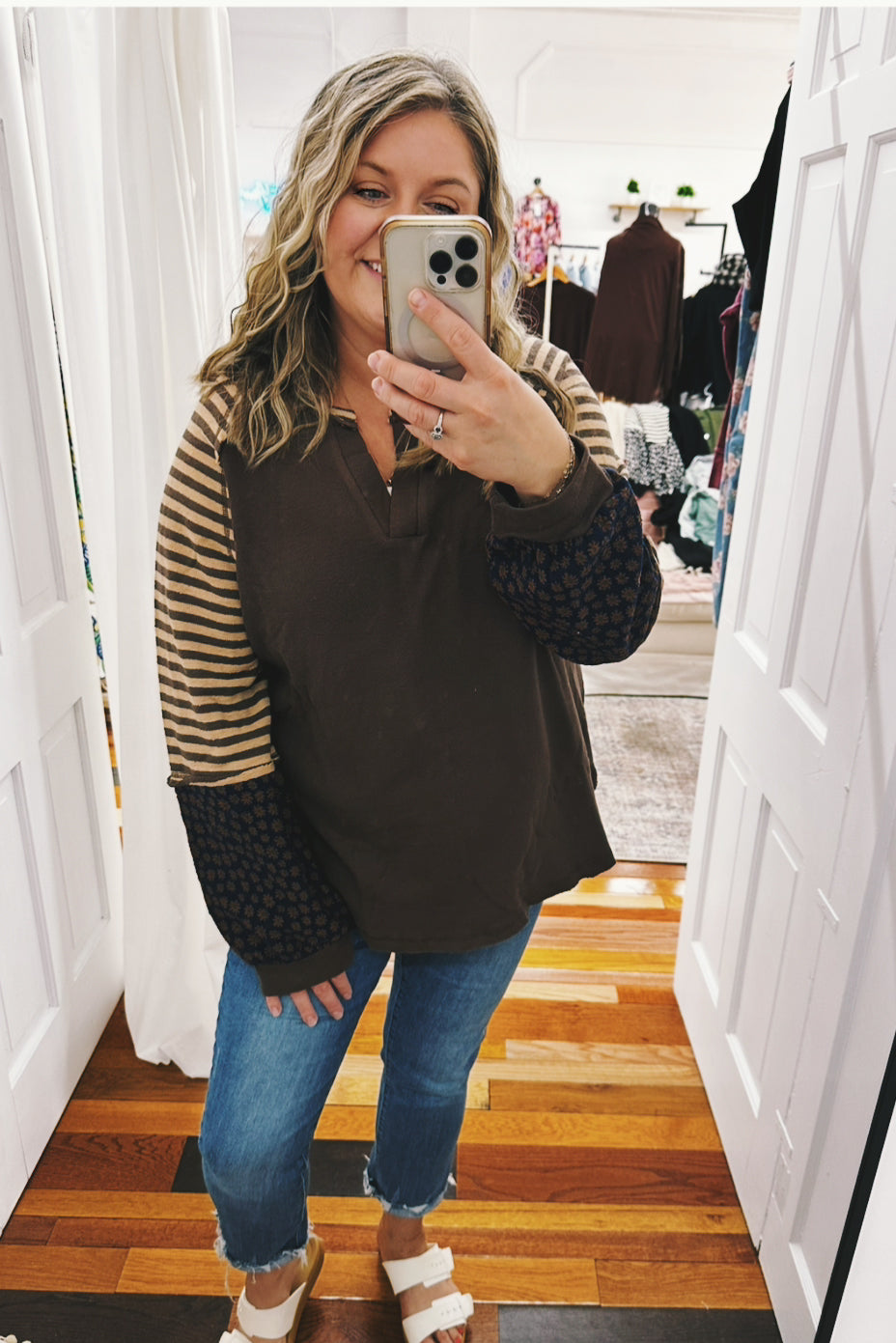 The colors of Fall....The Regina Oversized Floral & Stripe Top blends cozy French terry with bold mocha, chocolate, navy, rust, and teal hues for a playful look. Its notch V-neck and exposed seams add unique style, while the oversized fit keeps you comfy and effortlessly cool. Perfect for adding fun layers to your wardrobe!